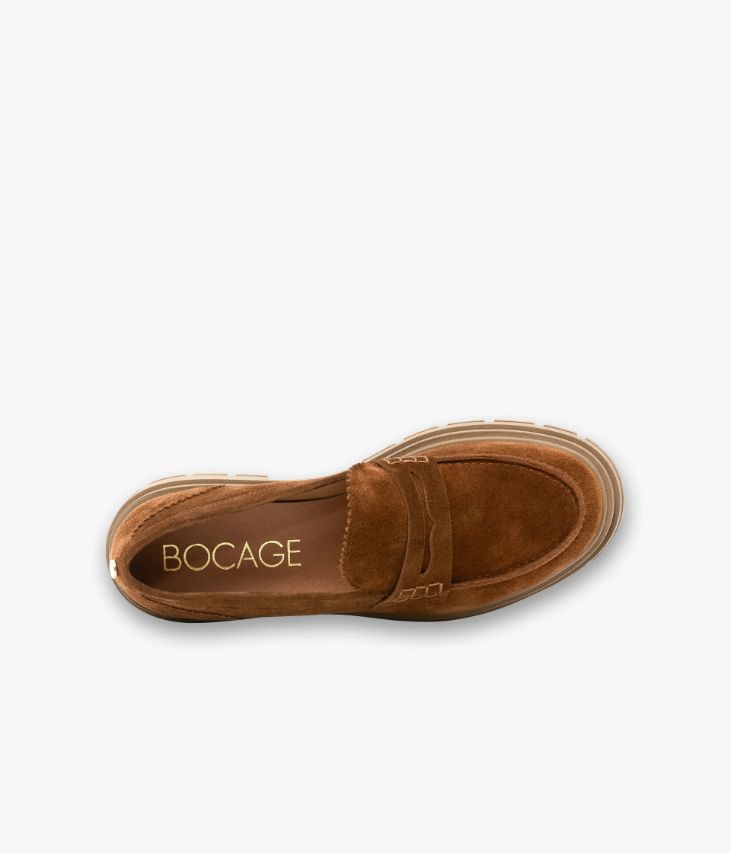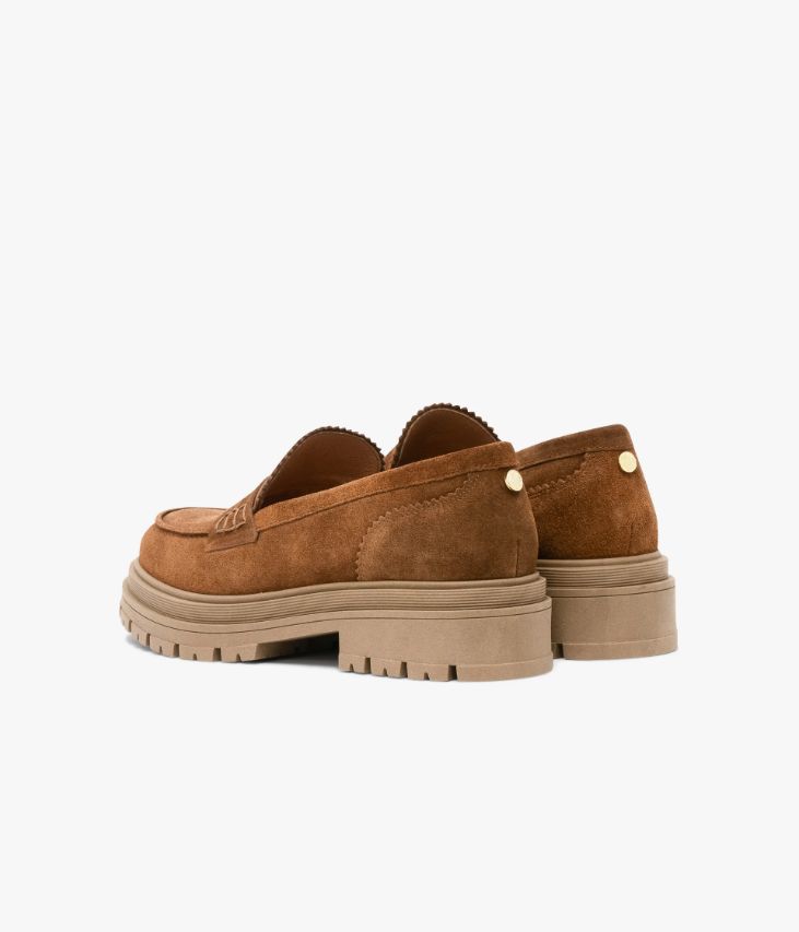 Un mocassin chunky cognac en cuir velours huilé fabriqué avec soin au Portugal. Il affiche une surpiqûre en relief sur le dessus et un bandeau perforé avec piqûres sellier. Ce mocassin se distingue par ses finitions dentelées sur la languette et au talon et par son épaisse semelle crantée. Une chaussure entièrement doublée cuir avec semelle intérieure cuir dotée d’une fine mousse. Petit logo doré au talon.