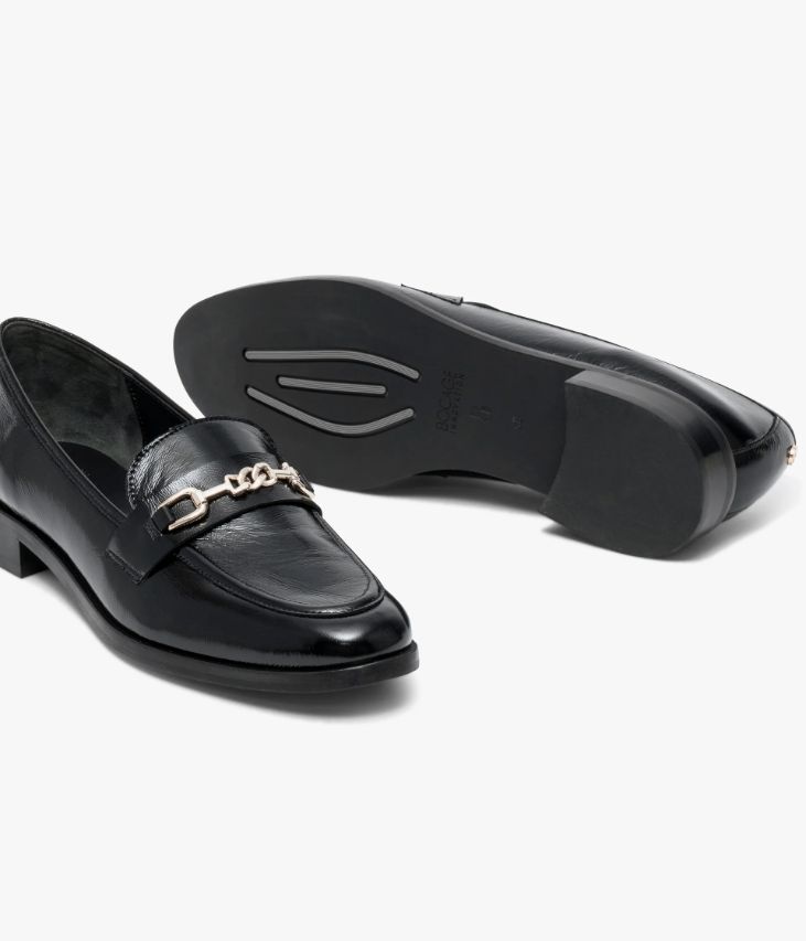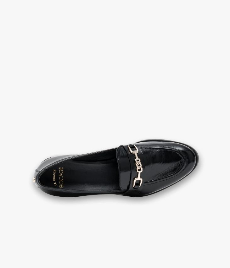 Un élégant mocassin noir en cuir vintage fabriqué avec soin dans notre propre atelier en France, au cœur du Maine et Loire (49). Un modèle chic sublimé par un bijou doré en forme de mors sur le bandeau. Sa ligne effilée avec bout amande lui confère une allure particulièrement féminine. Son cuir vintage est un cuir d'aspect vieilli qui se patine avec le temps, un cuir brillant qui affiche un aspect plus ou moins froissé, dont la tonalité peut varier, et qui peut avoir un aspect "déjà porté". Ce mocassin repose sur une semelle légèrement débordante et un petit talon lamellé collé. Notre technologie Bocage Innovation vous garantit un bien-être inégalé. La semelle dissimule des élastiques qui permettent à votre chaussure de s’adapter à votre pied. Une chaussure entièrement doublée cuir, avec semelle intérieure cuir dotée d’une fine mousse. Logo signature au talon.
