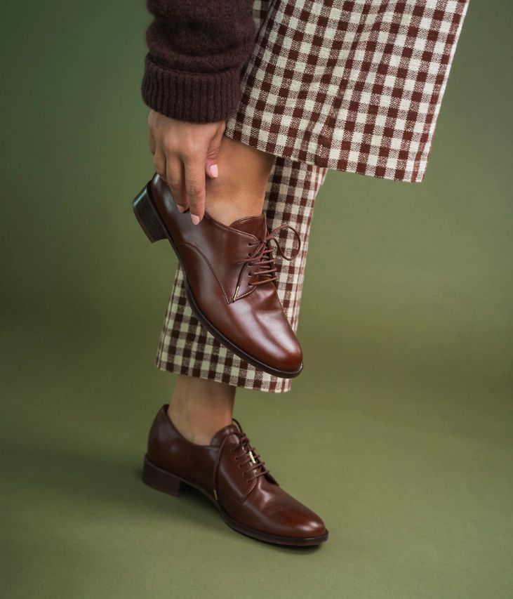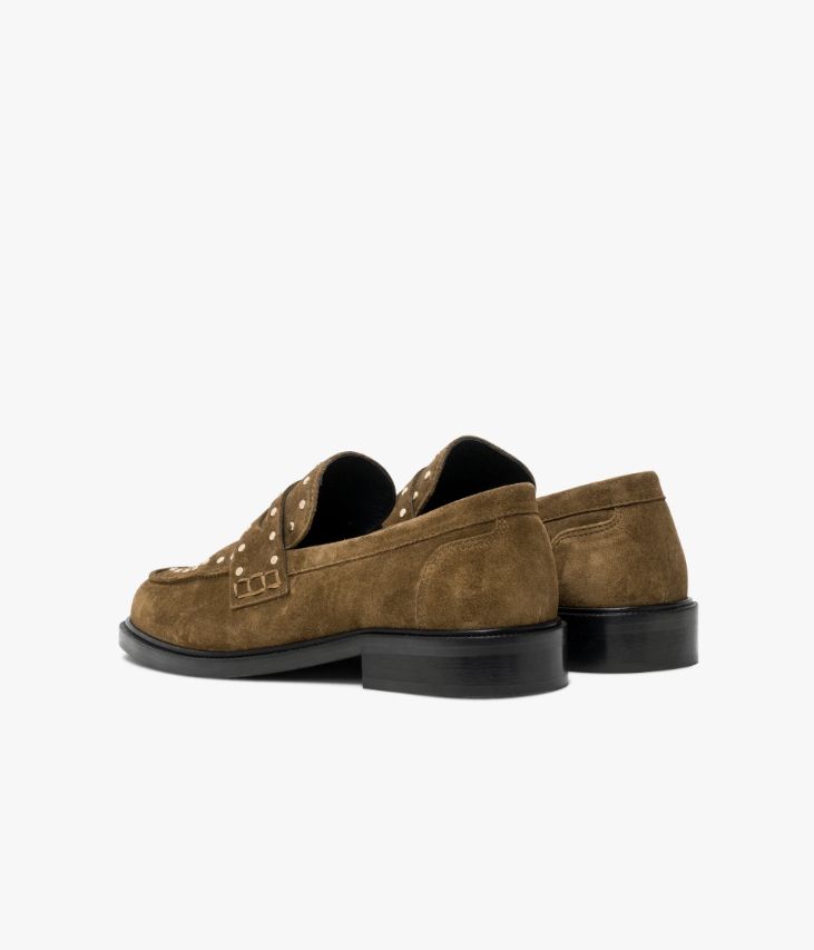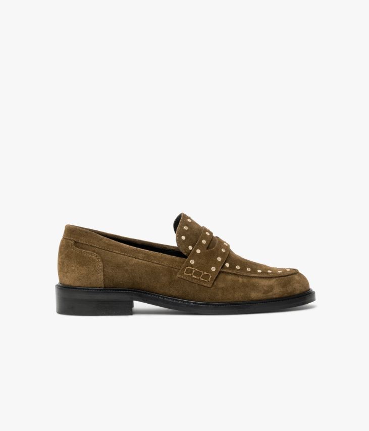 Un mocassin en cuir velours couleur havane fabriqué avec soin au Portugal. Un modèle très élégant avec sa ligne effilée avec son bout amande, dont le plateau et le bandeau perforé sont ornés de petits clous en métal doré. Il repose sur une semelle débordante avec double trépointe cuir ciselée. Une chaussure doublée cuir et coton recyclé avec semelle intérieure cuir dotée d’une fine mousse.