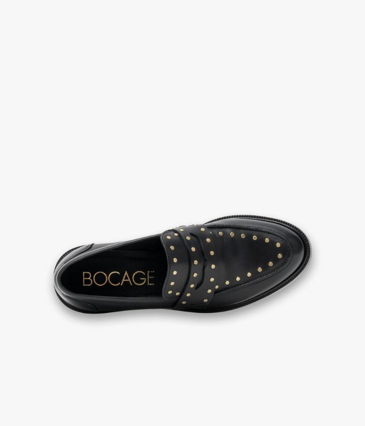 Un mocassin en cuir lisse noir fabriqué avec soin au Portugal. Un modèle très élégant avec sa ligne effilée avec son bout amande, dont le plateau et le bandeau perforé sont ornés de petits clous en métal doré. Il repose sur une semelle débordante avec double trépointe cuir ciselée. Une chaussure doublée cuir et coton recyclé avec semelle intérieure cuir dotée d’une fine mousse.