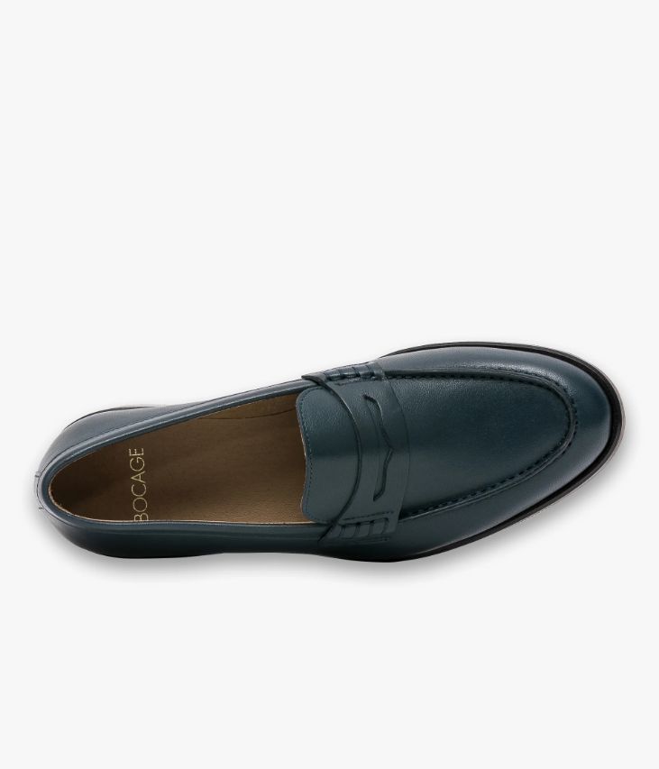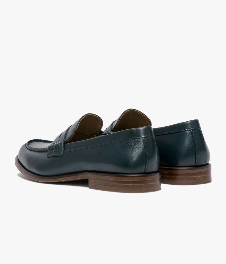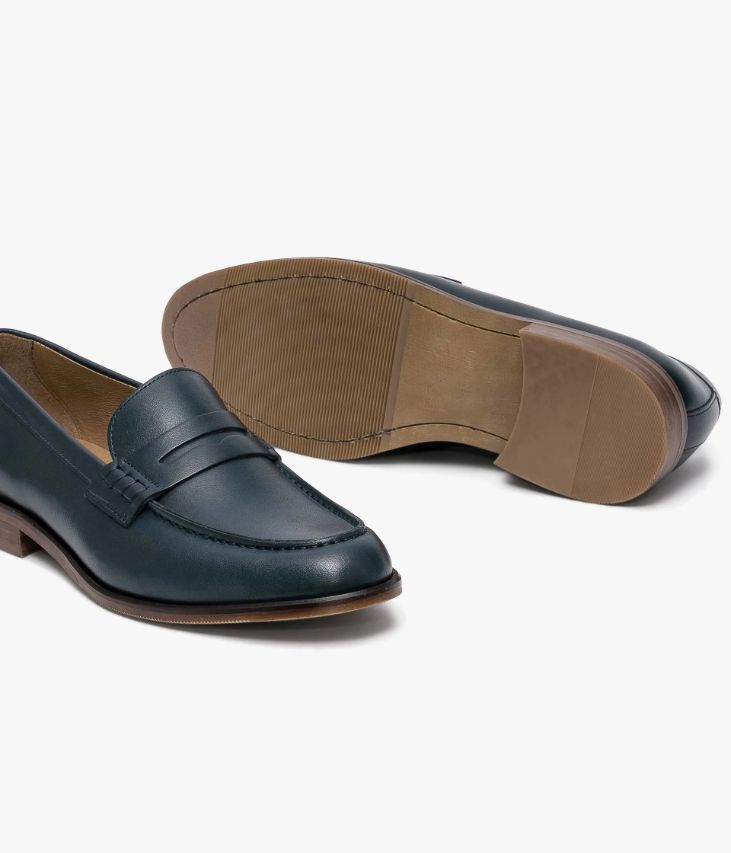 Un mocassin en cuir lisse marine fabriqué avec soin au Portugal. Une chaussure à la ligne effilée avec bout amande réalisée dans un joli cuir patiné à la main. Elle affiche une couture en relief sur le dessus et un bandeau perforé agrémenté de piqûres sellier. Une chaussure entièrement doublée cuir avec semelle intérieure cuir dotée d’une fine mousse. Cette paire bénéficie du cousu Blake, une couture unique prenant, à la fois, la semelle intérieure, la semelle extérieure et la tige de la chaussure. Ce montage est apprécié pour la finesse de la semelle. Semelle avec patin antidérapant.