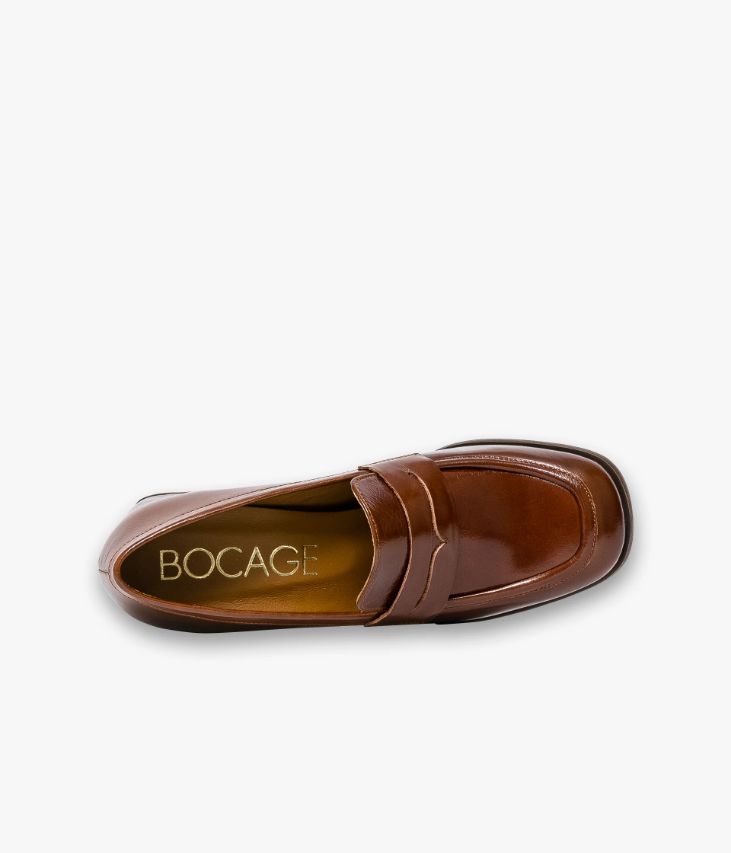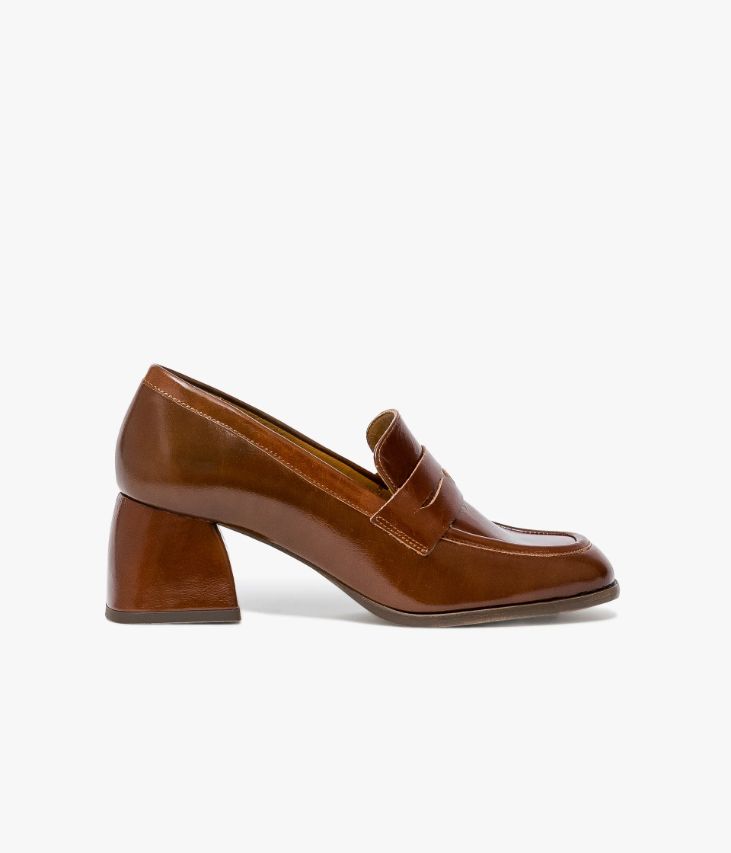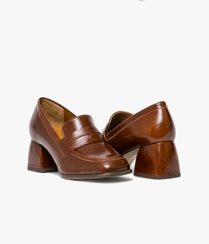 Un mocassin en cuir cognac fabriqué avec soin au Portugal. Il affiche une surpiqûre en relief sur le dessus et un bandeau perforé. Ce mocassin possède un bout carré posé sur une trépointe débordante et un talon flare enrobé aux lignes courbes qui lui confèrent une allure rétro. Une chaussure entièrement doublée cuir avec semelle intérieure moussée. Son cuir vintage est un cuir d'aspect vieilli qui se patine avec le temps, un cuir brillant qui affiche un aspect plus ou moins froissé, dont la tonalité peut varier, et qui peut avoir un aspect "déjà porté".