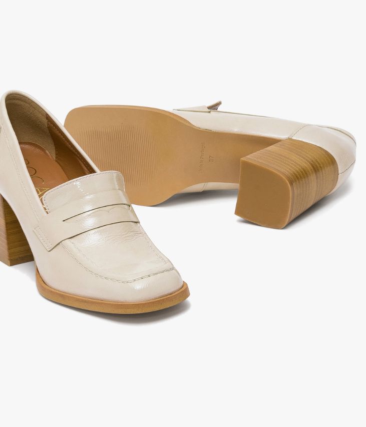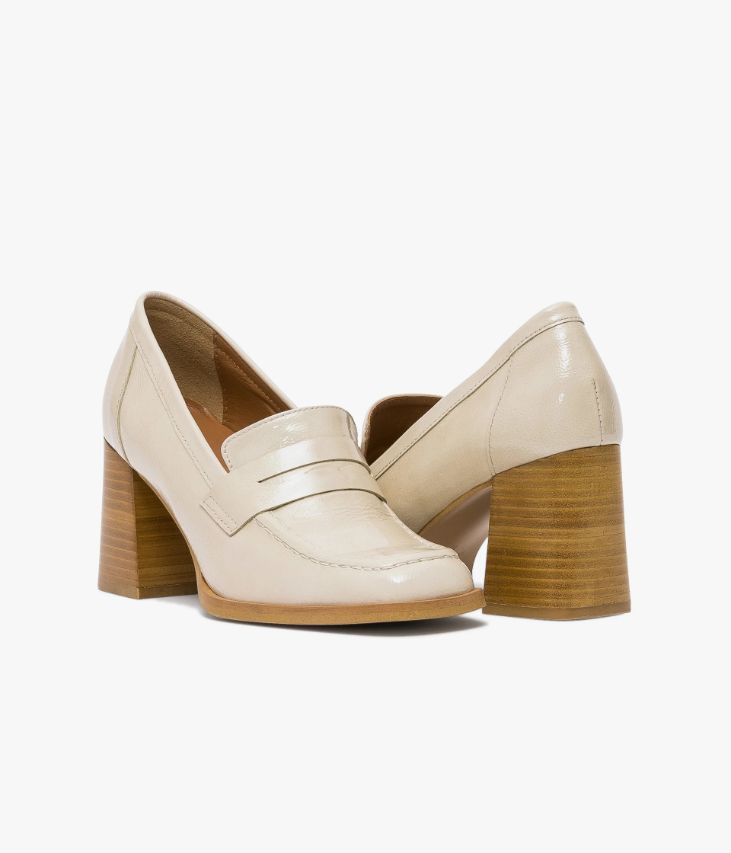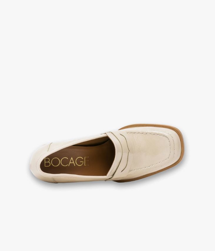 Un mocassin beige en cuir verni,fabriqué avec soin dans notre atelier au Portugal. Une chaussure inspirée duvestiaire vintage avec bout carré et talon flare. Entièrement doublée cuir,elle possède une semelle intérieure cuir dotée d’une fine mousse. Ce mocassinfemme repose sur une semelle avec trépointe débordante et un talon lamellécollé. Ce cuir Naplak particulièrement souple peut présenter des irrégularités.