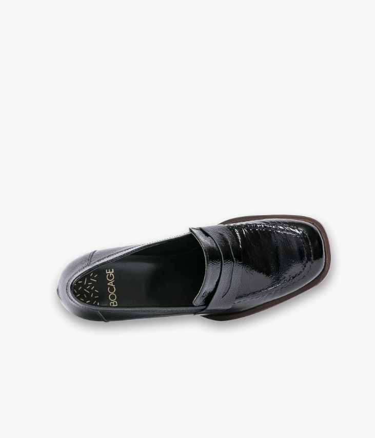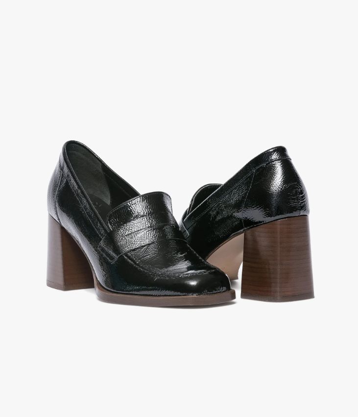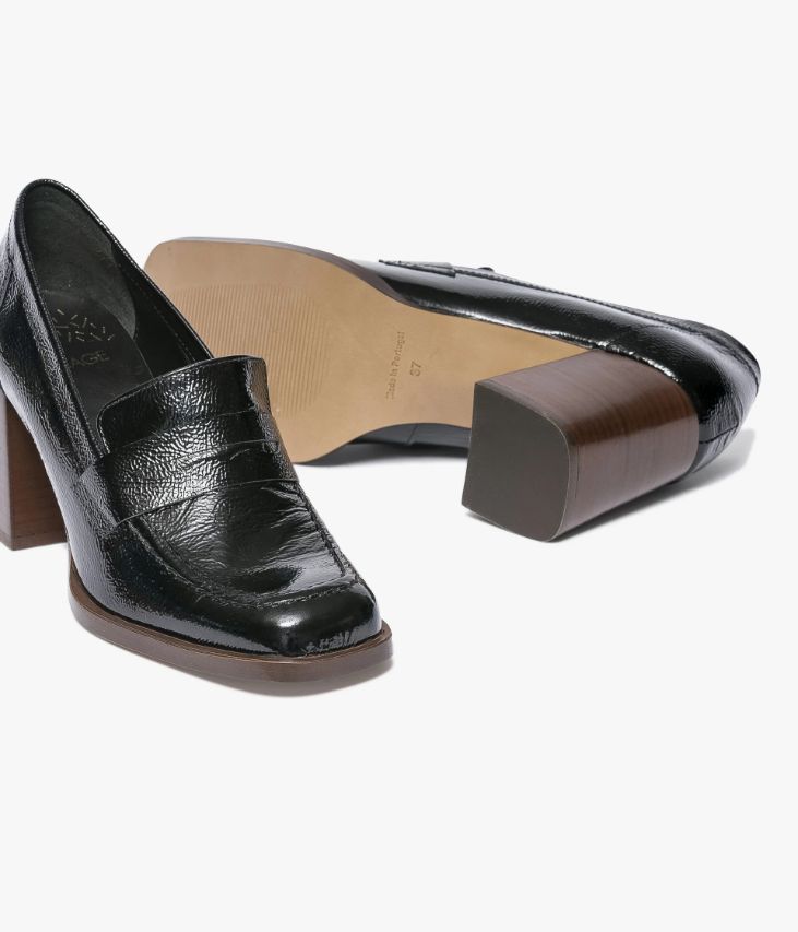 Un mocassin noir en cuir verni esprit escarpin,fabriqué avec soin dans notre atelier au Portugal. Une chaussure inspirée duvestiaire vintage avec bout carré et talon flare. Entièrement doublée cuir,elle possède une semelle intérieure cuir dotée d’une fine mousse. Ce mocassinfemme repose sur une semelle avec trépointe débordante et un talon lamellécollé. Ce cuir Naplak particulièrement souple peut présenter des irrégularités.