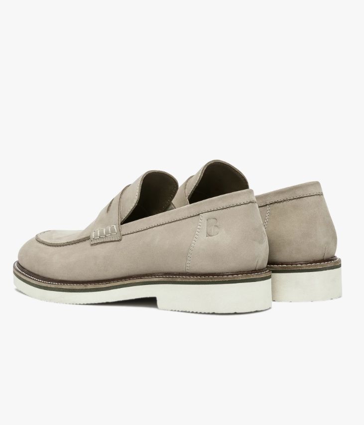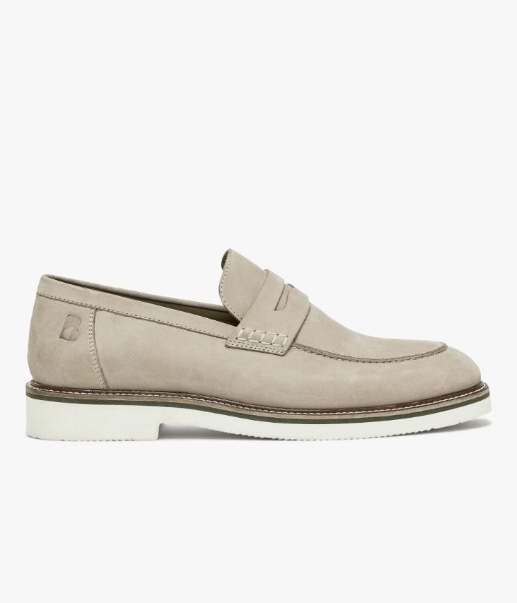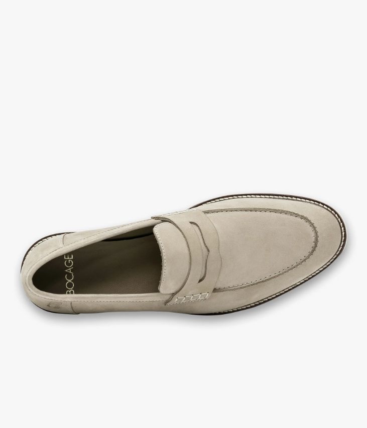 Un mocassin beige en cuir nubuck fabriqué avec le plus grand soin. Ce mocassin à bout amande arbore une surpiqûre en relief sur le plateau, un bandeau perforé orné de piqûres façon sellier et un logo embossé au talon. Un mocassin entièrement doublé cuir avec semelle intérieure cuir dotée d’une fine mousse. Il est posé sur une épaisse semelle écru très légère, avec trépointe surpiquée.