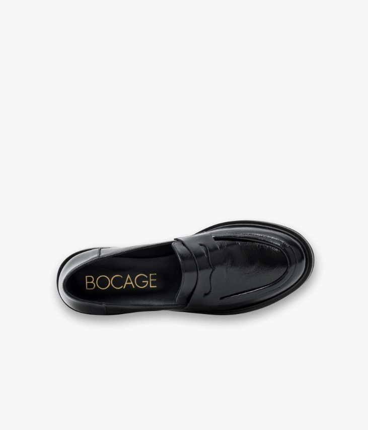 Un mocassin en cuir verni noir fabriqué avec soin au Portugal. Inspiré d'un classique du vestiaire féminin, il arbore un bout amande, une couture en relief sur le plateau et un bandeau perforé. Ce mocassin femme repose sur une semelle légère avec trépointe cuir débordante et un large talon lamellé collé. Une chaussure entièrement doublée cuir avec semelle intérieure cuir dotée d'une fine mousse. Ce cuir Naplak particulièrement souple peut présenter un aspect légèrement froissé.