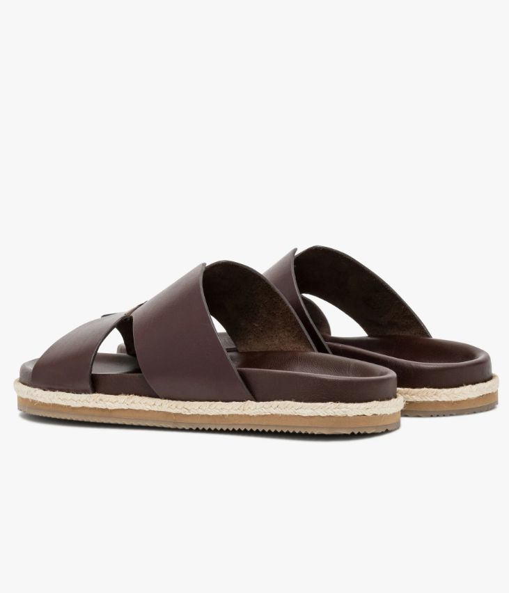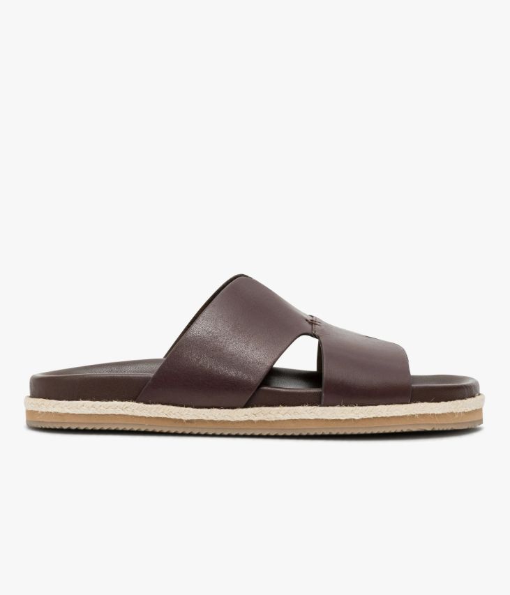 Une mule en cuir chocolat fabriquée avec le plus grand soin. Dotée d’une large bride aux lignes graphiques, cette mule pour homme affiche une allure contemporaine. Elle repose sur une semelle bordée de corde tressée, inspirée des espadrilles, qui lui confère une allure décontractée. Cette mule pour homme, non doublée pour plus de souplesse, possède une semelle intérieure anatomique enrobée de cuir. Elle s’enfile facilement et accompagne toutes les tenues estivales.