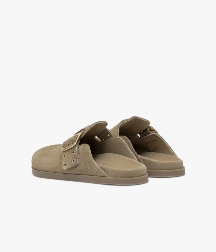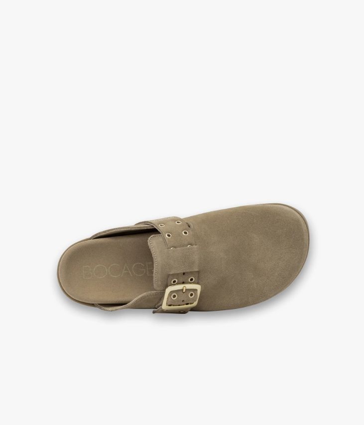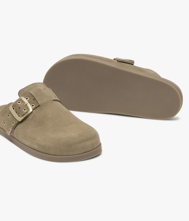 Une mule sabot en cuir velours beige fabriquée avec soin au Portugal. Un sublime sabot aux lignes féminines agrémenté d’une large bride ornée d’œillets métalliques, ajustable par une boucle en métal doré. Cette chaussure, entièrement doublée cuir, est dotée d’une semelle intérieure de forme anatomique et repose sur une semelle fine amortissante et confortable. Semelle 1 cm.