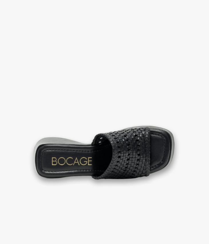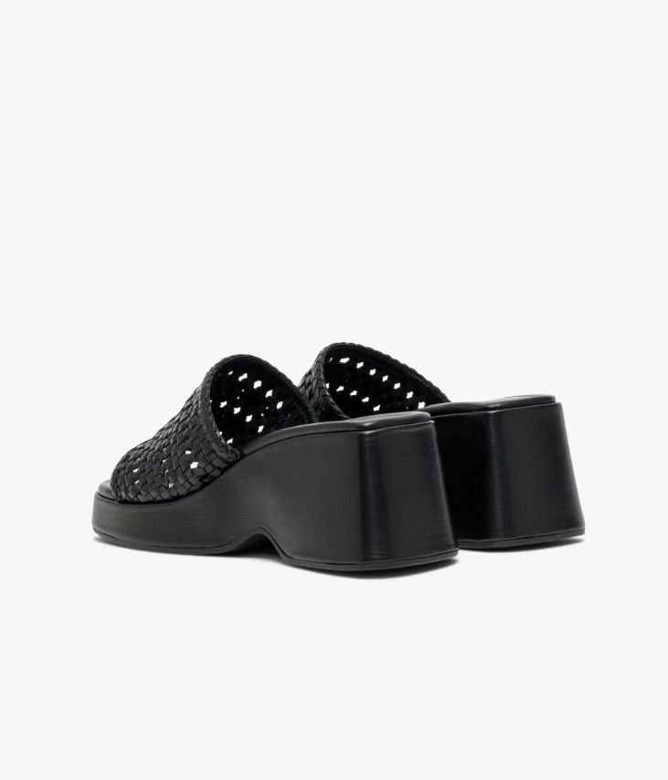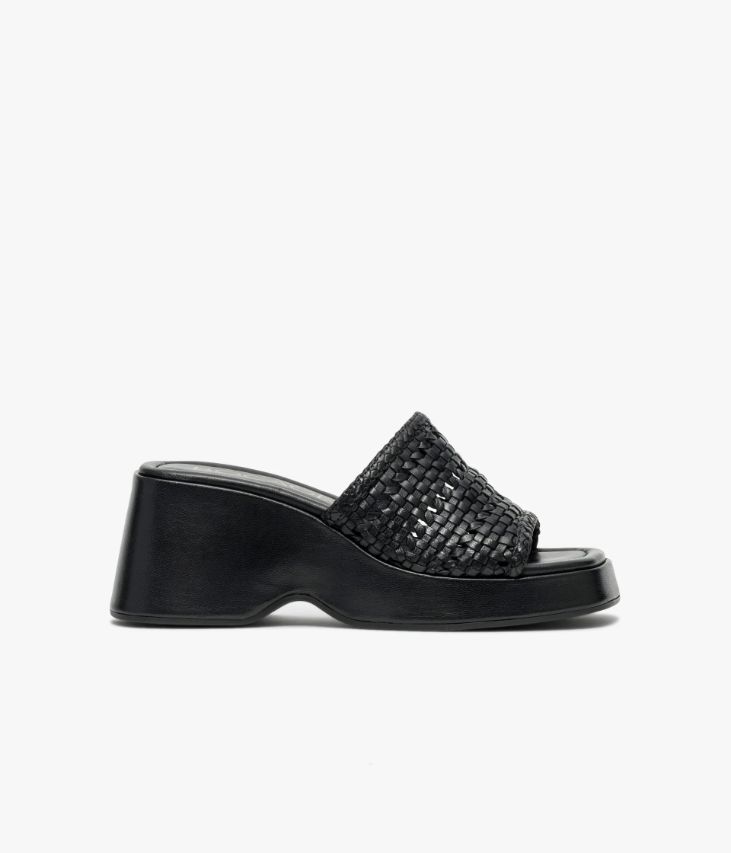 Une mule noire en cuir tressé fabriquée avec le plus grand soin. Une mule compensée esprit 90’s avec sa semelle plateforme enrobée à bout carré et son imposant talon. Sa large bride tressée sur l’avant s’adapte à la morphologie du pied pour assurer une marche confortable. Une chaussure non doublée pour offrir plus de souplesse, avec semelle intérieure cuir dotée d’une fine mousse. Semelle 2,5 cm.