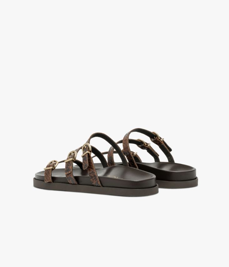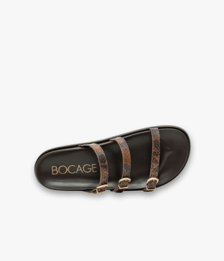 Une mule en cuir chocolat imprimé python fabriquée avec soin au Portugal. Elle sublime le pied par trois fines brides réglables à l’aide de boucles dorées en métal poli, offrant un ajustement idéal à chaque pied. Cette mule plate, doublée cuir, repose sur une semelle de forme anatomique très confortable et une semelle extérieure antidérapante.