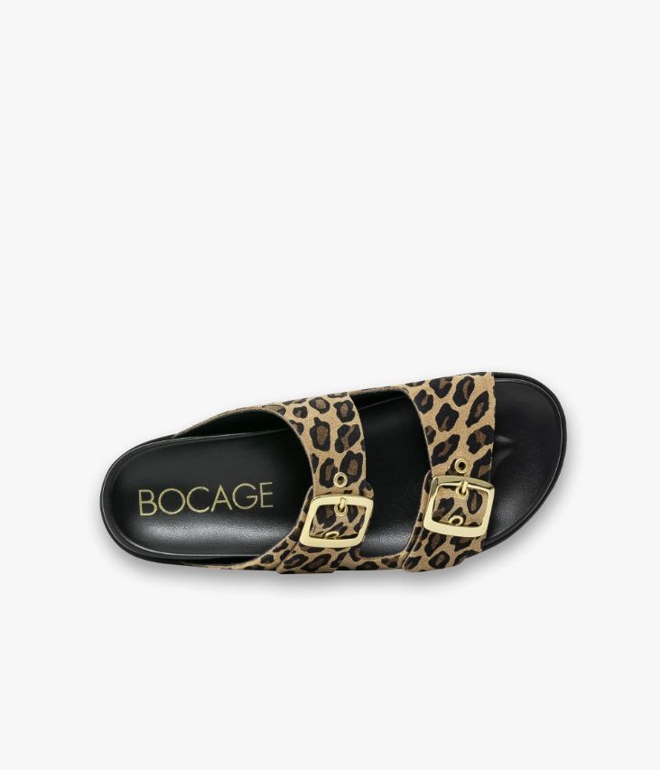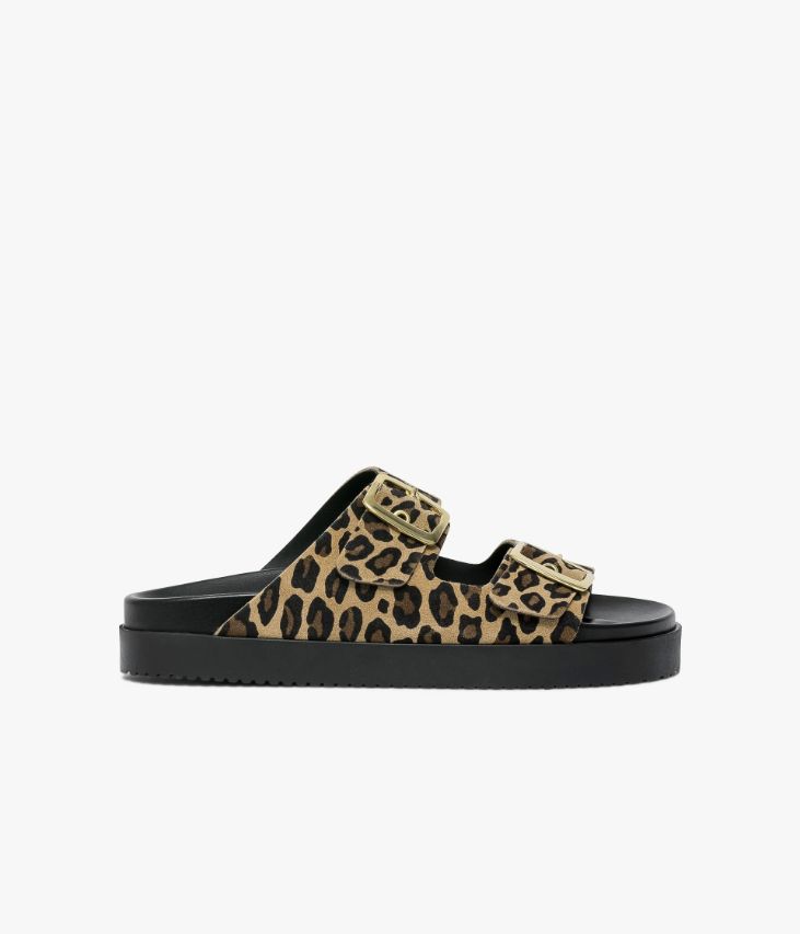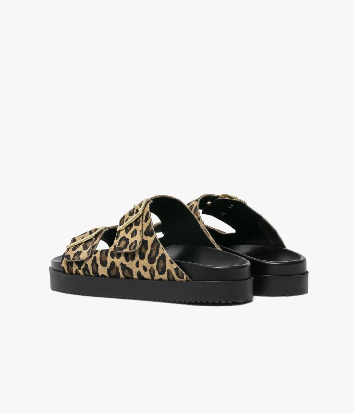Une sandale en cuir velours beige à motif léopard fabriquée avec soin au Portugal. Composée de deux larges brides ajustables par boucles dorées, cette sandale plate s’ajuste à chaque morphologie. Une chaussure ouverte entièrement doublée cuir. Elle possède une semelle de forme anatomique enrobée et repose sur une épaisse semelle antidérapante.