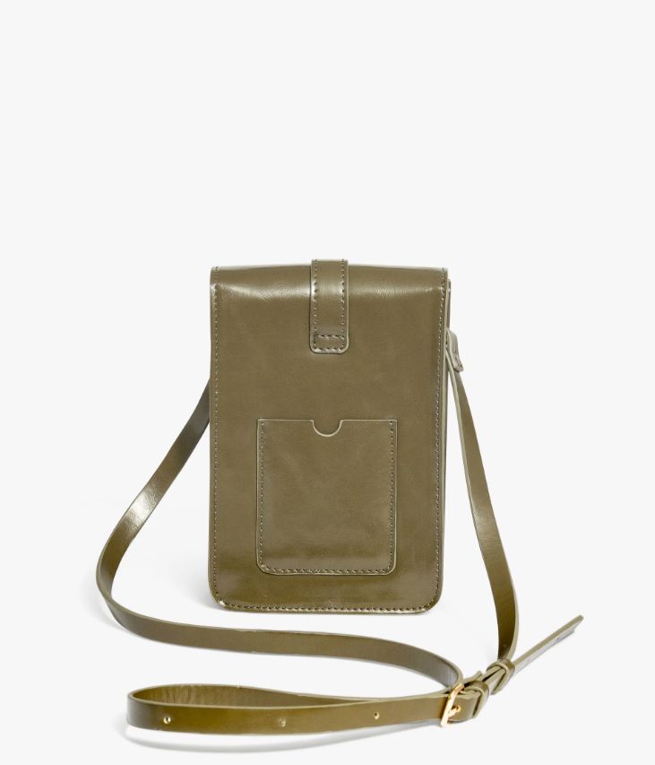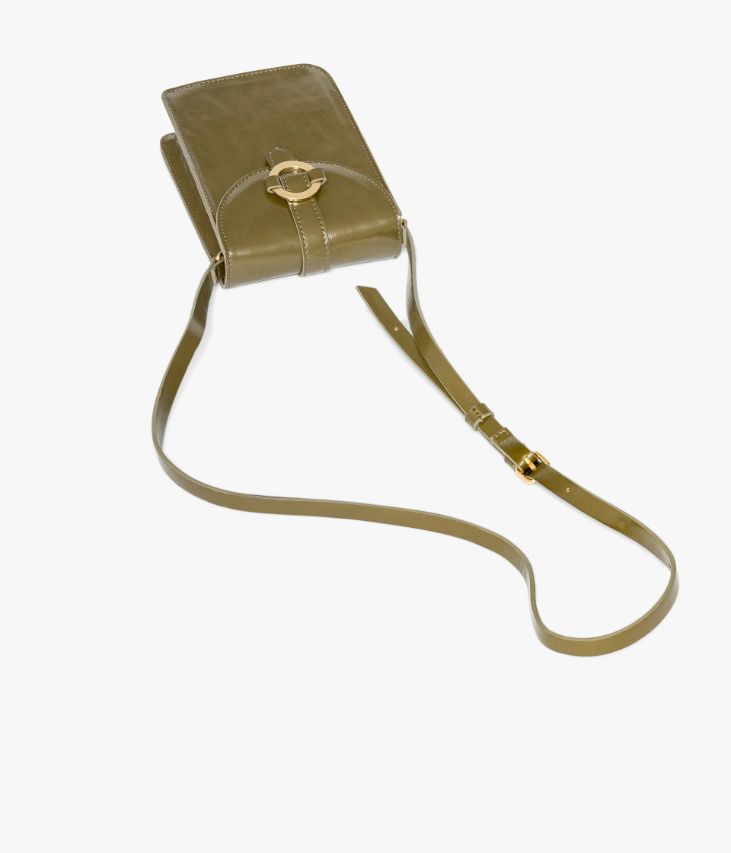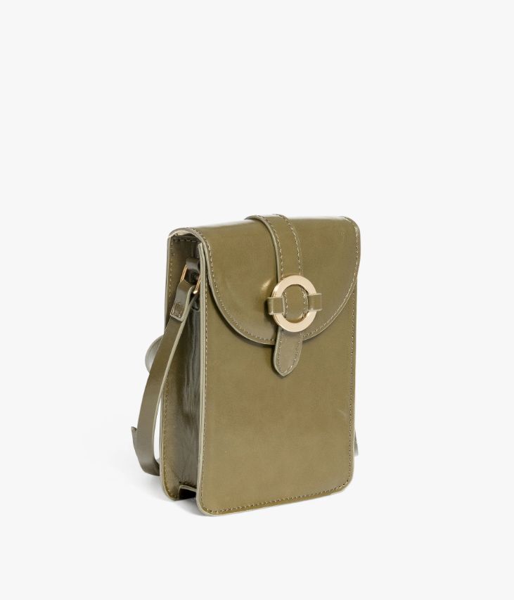 Une jolie pochette vert olive réalisée dans une matière brillante imitation cuir et sublimé par une boucle dorée sur le rabat. Une pochette au format idéal pour ranger son téléphone, qui se ferme par un bouton aimanté sous le rabat. Elle est munie d’une fine bandoulière ajustable en longueur permettant un porté épaule ou croisé. Doublure textile. Un seul compartiment. Dimensions : H18 x L12,5 x P4,5 cm.
