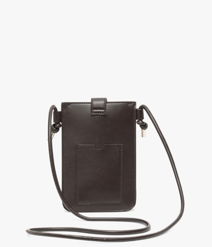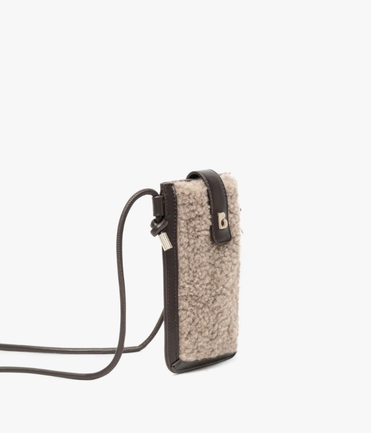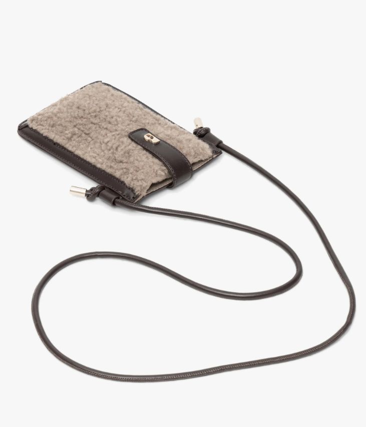 Une jolie pochette téléphone en sherpa cappuccino et matière synthétique chocolat. Alliance parfaite entre style et fonctionnalité, cette pochette est prévue pour accueillir votre téléphone et quelques petits objets. Elle possède une poche arrière au format carte bancaire. Cette pochette téléphone se ferme à l’aide d’une bride ornée d’un logo doré, avec bouton aimanté, et possède une fine bandoulière aux finitions nouées, ajustable en longueur. Un accessoire idéal pour garder les mains libres tout en restant connectée. Doublure en polyester recyclé. Dimensions : H19 x L13 cm.