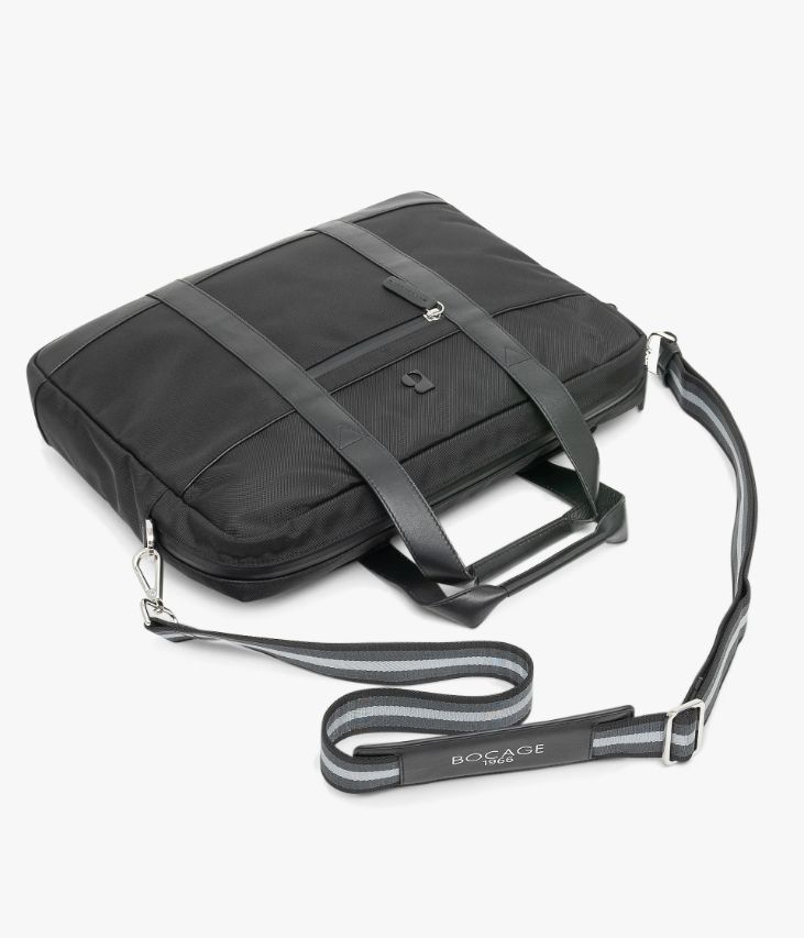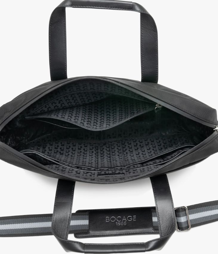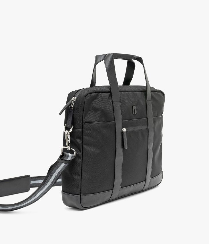 Une pochette d’ordinateur pour homme noire réalisée dans un mix de toile nylon déperlante et de cuir lisse. Elle offre de nombreux compartiments dont certains sont matelassés pour une protection optimale de votre ordinateur portable, et permet une bonne organisation de tous vos documents professionnels. Cette pochette se ferme par zip hermétique à double curseur et se porte à la main grâce deux anses en cuir ou sur l’épaule à l’aide de la bandoulière amovible. Elle est dotée d’une poche au dos avec zip dans le bas permettant de l’enfiler sur la poignée de traction d’une valise. Logo en métal noir sur l'avant. Un joli sac livré dans un pochon en coton. Dimensions : H30 x L40 x P6 cm.