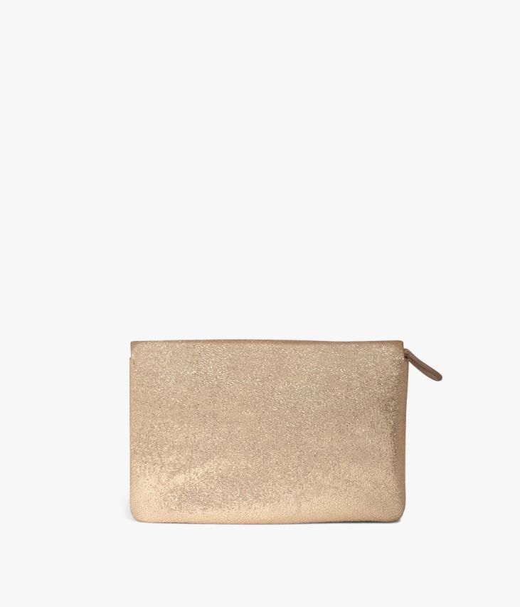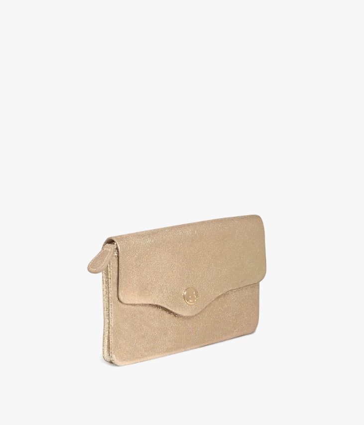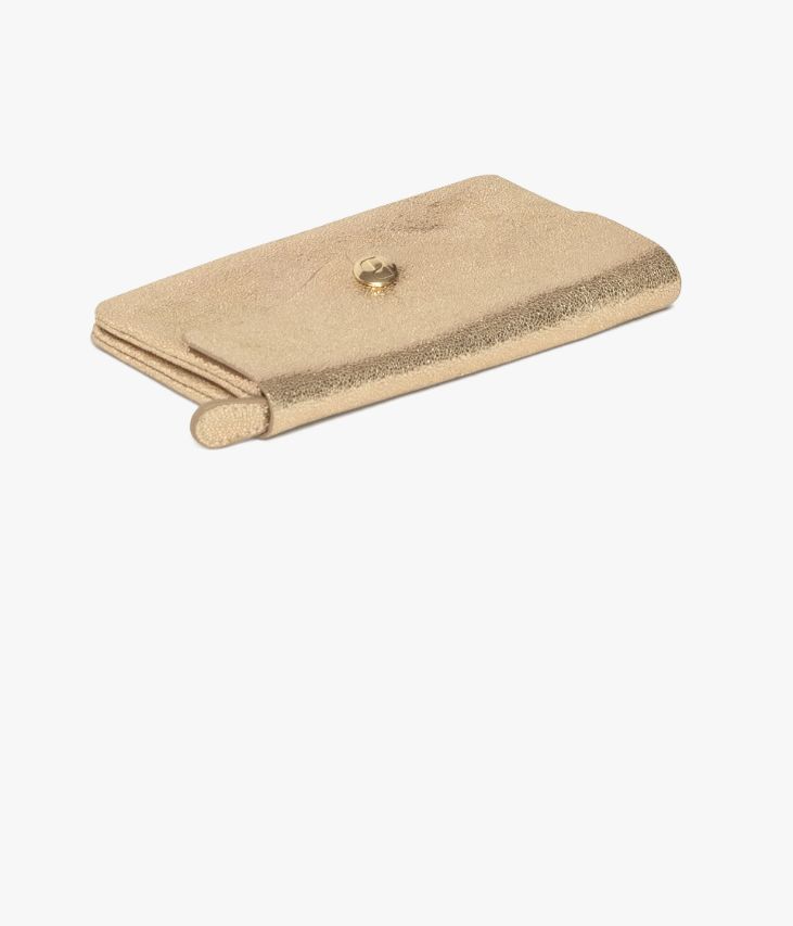 Un portefeuille en cuir métallisé doré ultra souple. Il se compose de deux grands compartiments dont un zippé, qui permettent de ranger tous vos papiers d’identité, vos cartes de crédit et votre monnaie. Il se ferme grâce à un rabat avec bouton pression orné d’un logo embossé. Un portefeuille ultra chic à glisser dans un sac à main ou à porter à la main comme pochette de soirée. Doublure coton. Livré dans une pochette en coton. Dimensions : H10 x L15,5 x P1 cm.