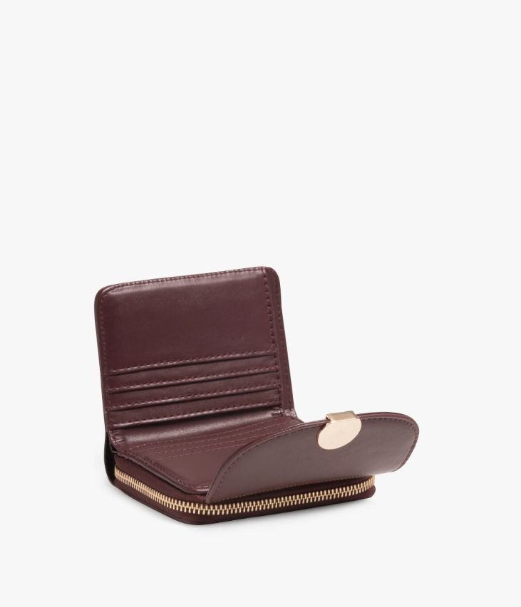 Un sublime porte-monnaie lie-de-vin en matière synthétique aspect vintage orné d'un fermoir doré. Il offre deux compartiments distincts, l’un fermé par un zip pour la monnaie, l’autre par un rabat à pression pour les cartes. Un accessoire de sac particulièrement élégant au format compact très pratique. Doublure en polyester recyclé. Dimensions : H10 x L12,5 x P3 cm.