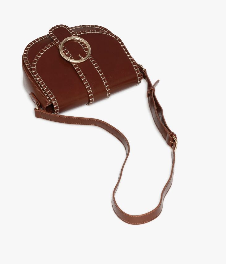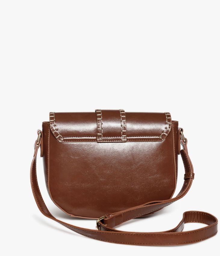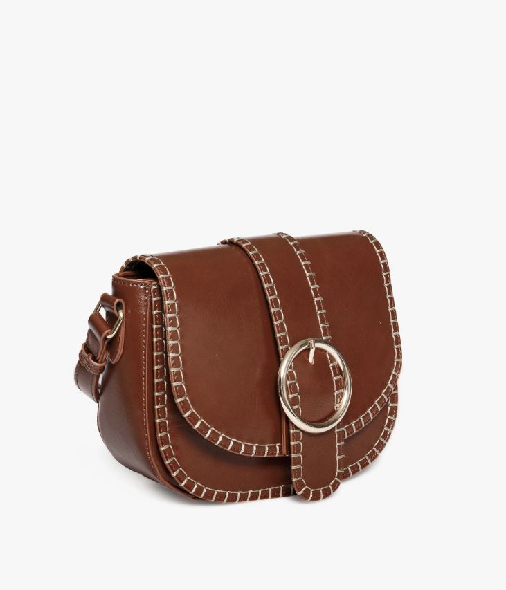 Un sac cognac, confectionné dans une matière lisse imitation cuir, agrémenté de surpiqûres en point échelle et d'un anneau doré sur le rabat. Il possède deux compartiments, deux pochettes et se ferme grâce à un bouton aimanté dissimulé sous le rabat. Ce sac à main possède une bandoulière ajustable grâce à une boucle à ardillon. Doublure en polyester recyclé. Dimensions : H18 x L22 x P7 cm.