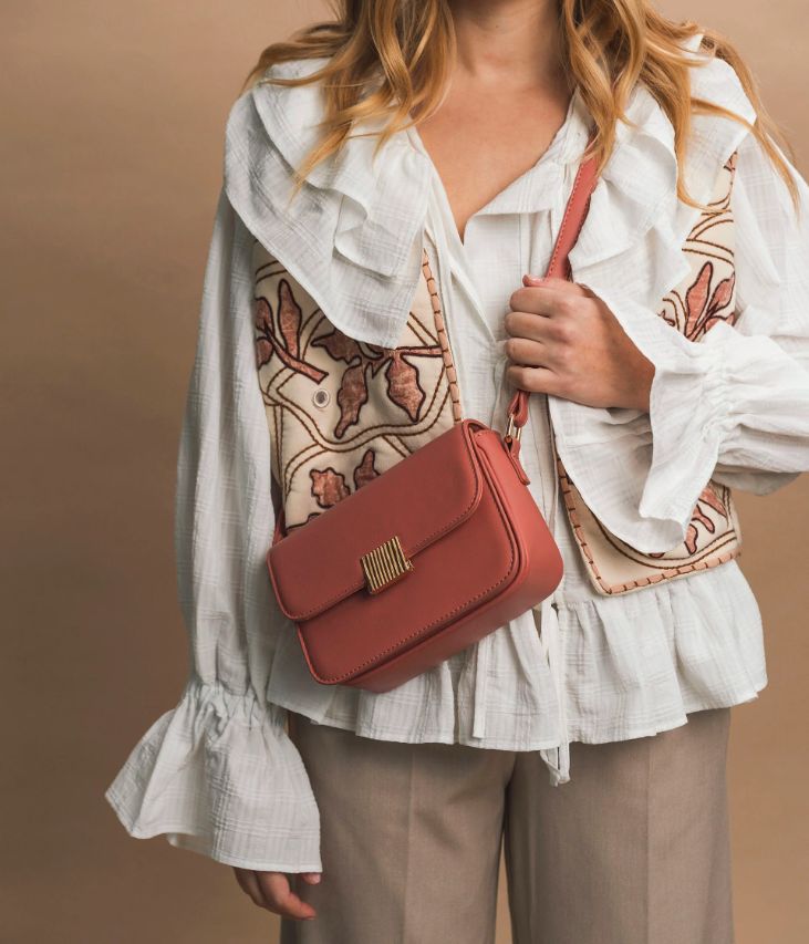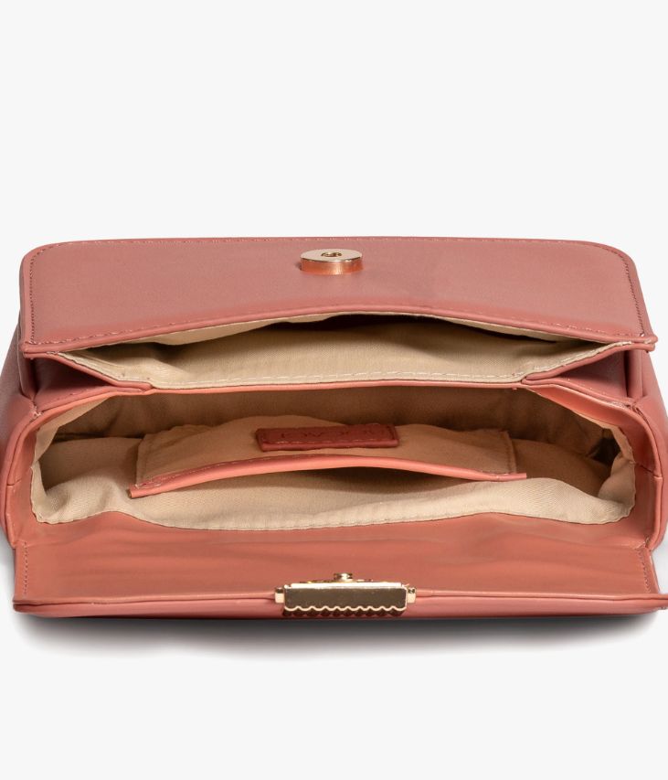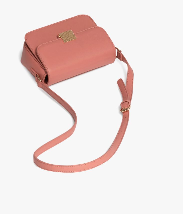 Un sac rose particulièrement chic avec son rabat orné d'un bijou en métal doré. Un petit sac à bandoulière à porter comme pochette de soirée pour ajouter la touche finale à une tenue élégante. Pratique, il possède deux compartiments et une pochette. Il se porte sur l'épaule ou croisé grâce à la bandoulière ajustable. Fermeture par bouton aimanté. Doublure en polyester recyclé. Dimensions : H13xL18,5xP6 cm.