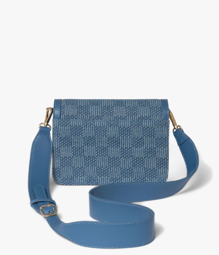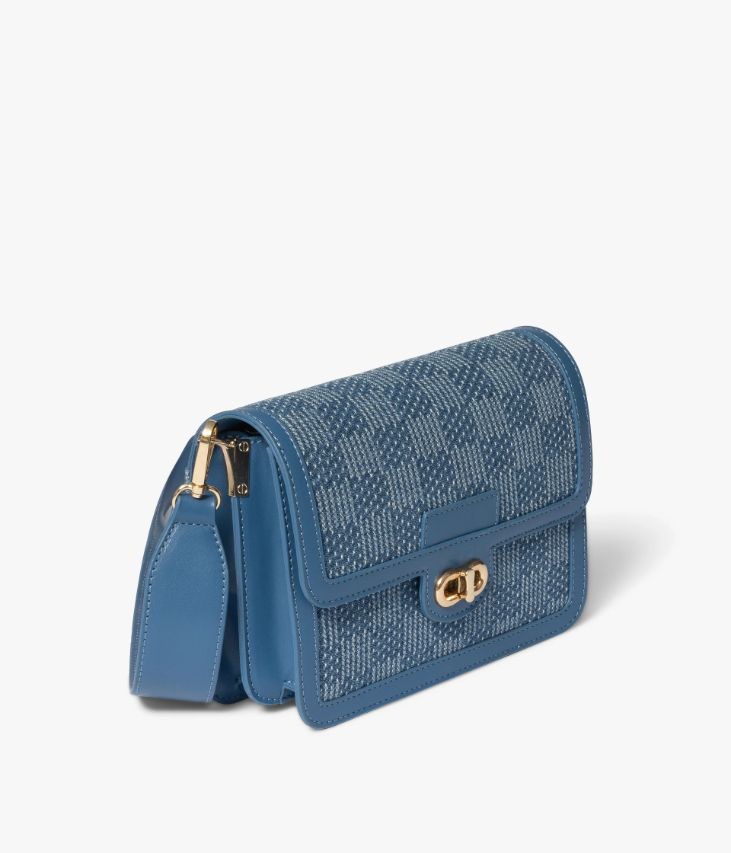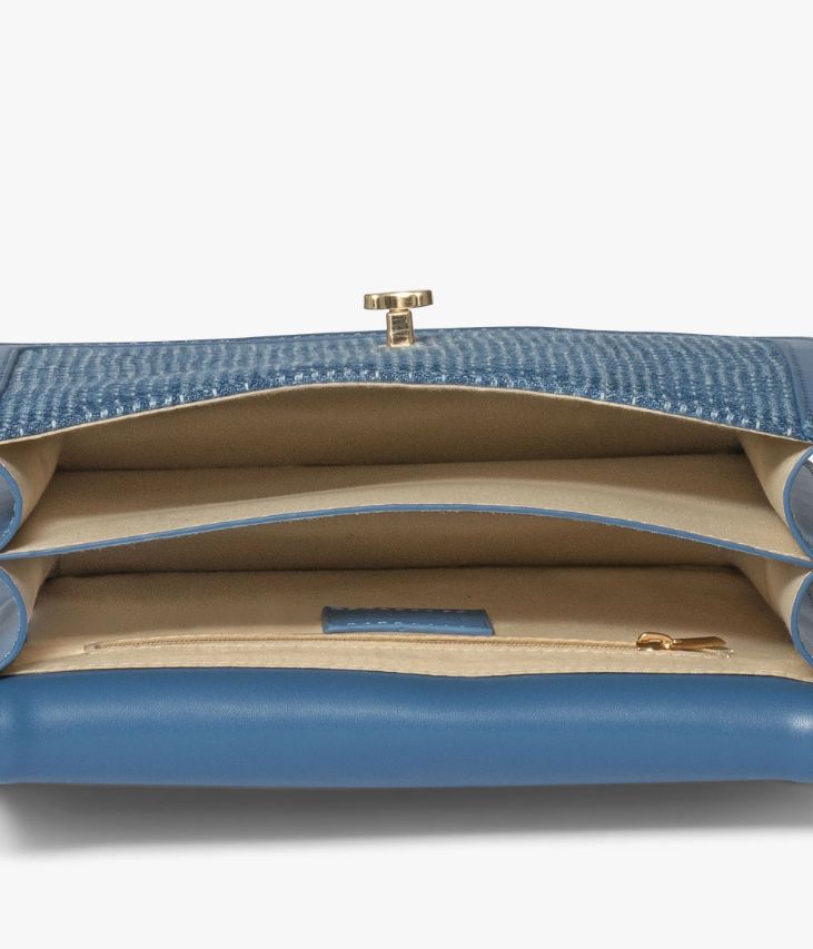 Un sac à rabat bleu denim confectionné dans une alliance de toile texturée et d’une matière lisse imitation cuir. Il se ferme grâce à un bouton tourniquet doré et possède deux compartiments et une pochette zippée. Ce sac à main possède une bandoulière amovible qui se fixe grâce à des mousquetons et s’ajuste grâce à une boucle métallique. Doublure textile. Dimensions : H16 x L22 x P7 cm.