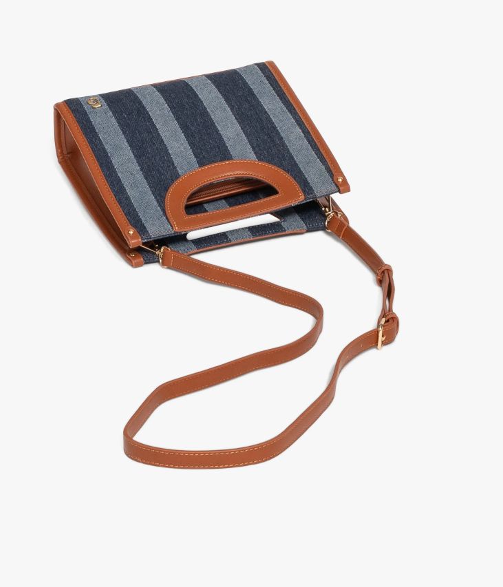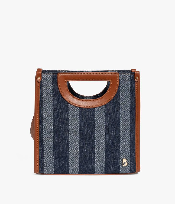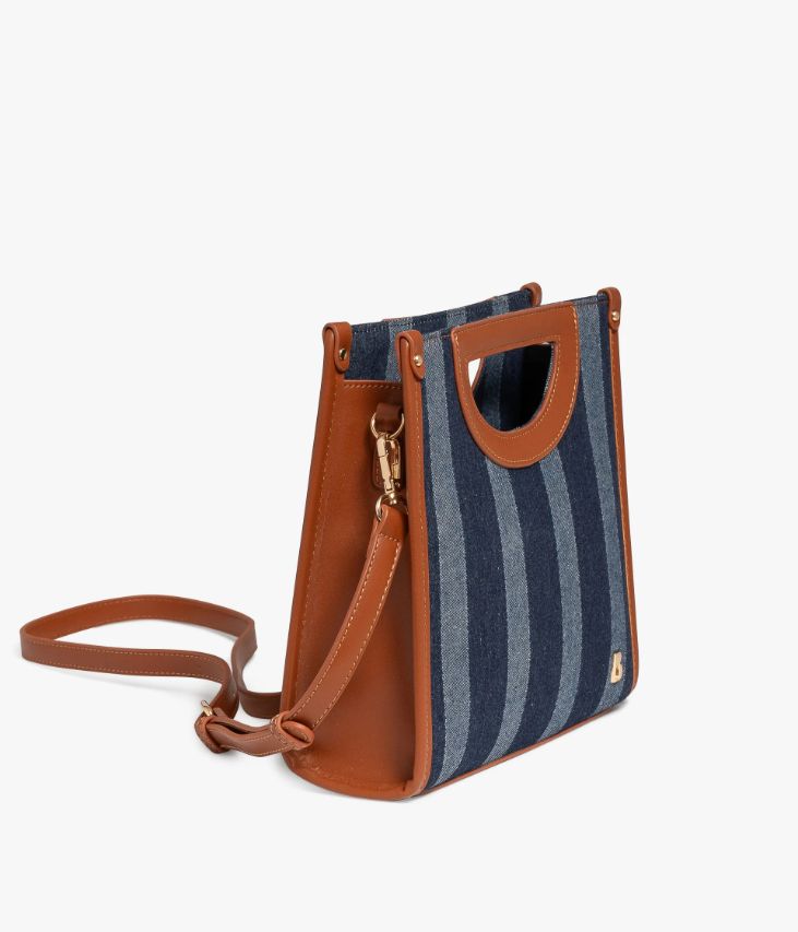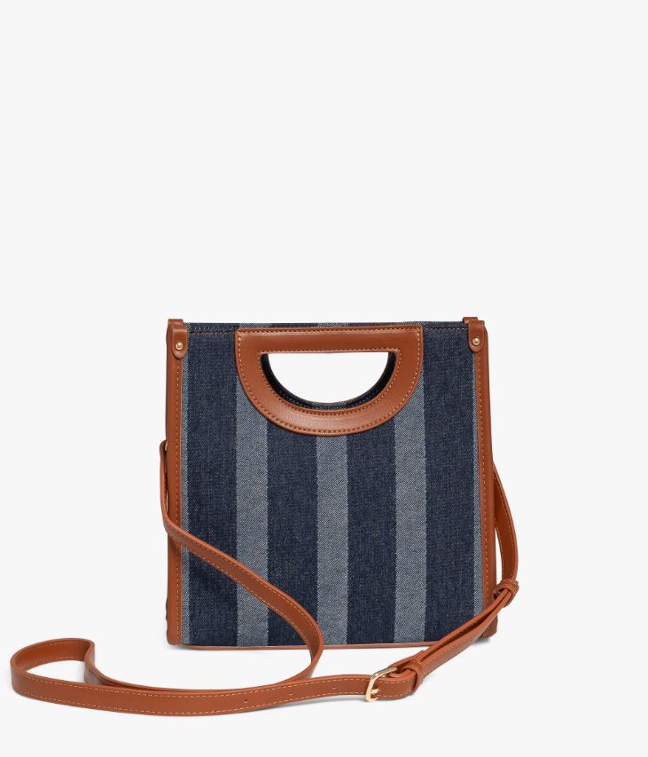 Un petit sac bleu en toile denim à rayures, rehaussé de jolies finitions cognac et de détails dorés. Un sac à main petit format offrant un compartiment et deux pochettes intérieures. Il offre deux possibilités de portés, à la main grâce à des anses intégrées ou croisé à l'aide d'une bandoulière amovible réglable en longueur. Fermeture zippée. Logo métallique sur l’avant. Doublure en polyester recyclé. Dimensions : H23xL23xP6 cm.