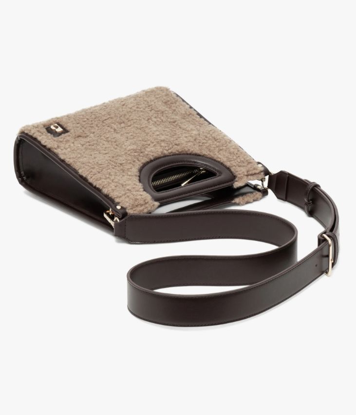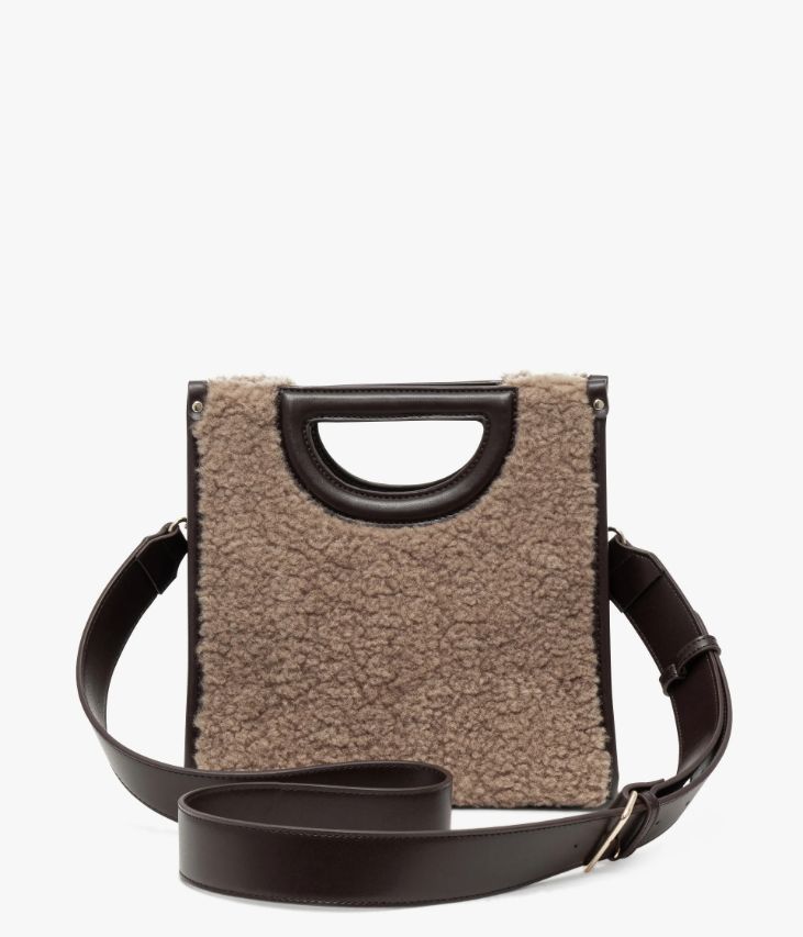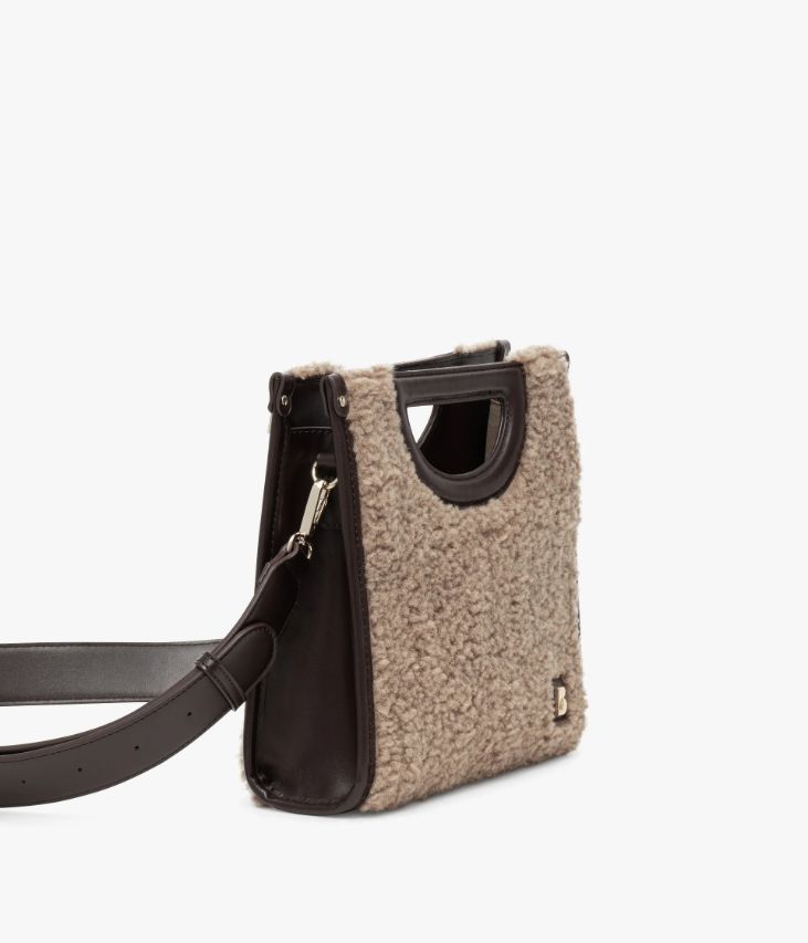 Un petit sac cappuccino sherpa, rehaussé de jolies finitions cognac et de détails dorés. Un sac à main petit format offrant un compartiment et deux pochettes intérieures. Il offre deux possibilités de portés, à la main grâce à des anses intégrées ou croisé à l'aide d'une bandoulière amovible réglable en longueur. Fermeture zippée. Logo métallique sur l’avant. Doublure en polyester recyclé. Dimensions : H23xL23xP6 cm.