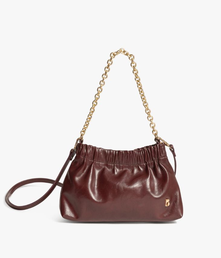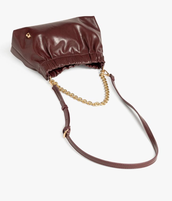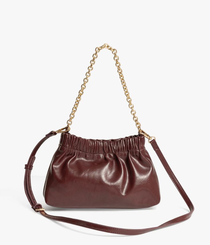 Un petit sac lie-de-vin en matière synthétique aspect cuir vintage, orné d’un logo doré, parfait pour accessoiriser les looks de soirée et les tenues de cérémonie. Sa forme bourse est resserrée par un large élastique et se ferme à l’aide d’un zip. Il possède un compartiment et une pochette, idéal pour emporter uniquement l’essentiel. Ce sac possède une chaine dorée décorative qui peut être utilisée comme anse et une bandoulière amovible ajustable en longueur permettant un porté épaule ou croisé. Doublure en polyester recyclé. Dimensions : H16 x L26 x P8 cm.