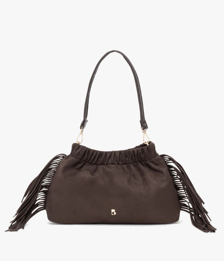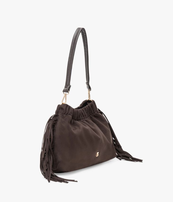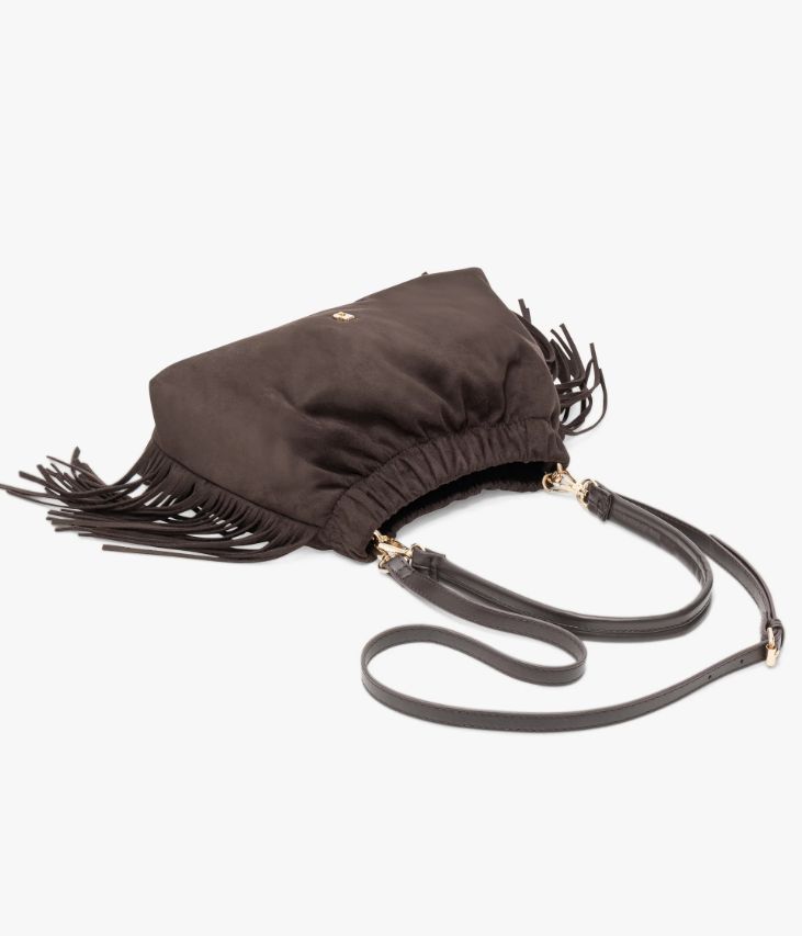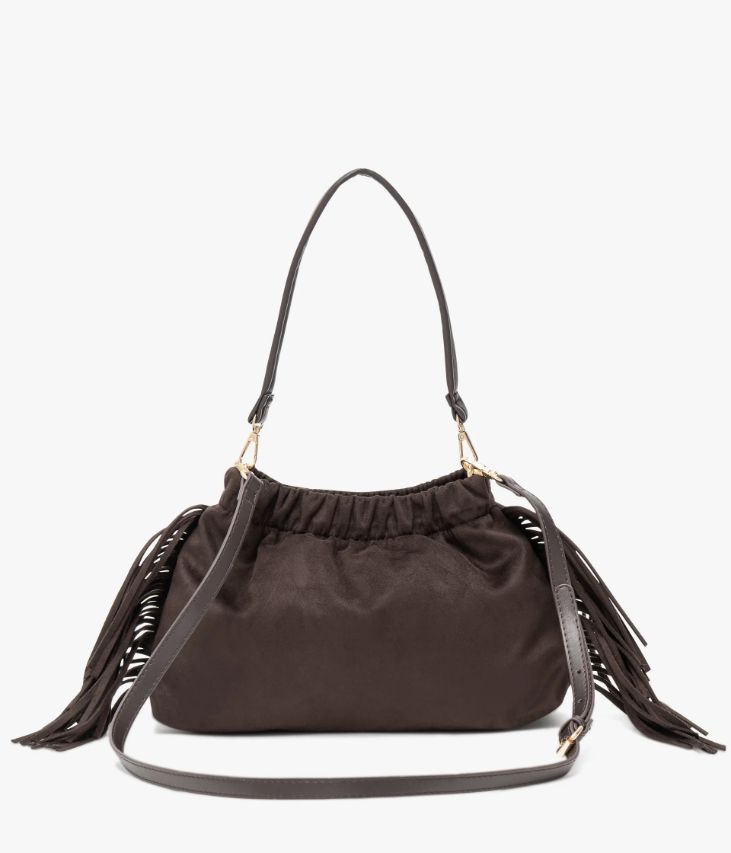Un sublime sac chocolat en suédine largement inspiré de la tendance folk. Il affiche un col élastique, de longues franges sur les côtés et un logo doré sur l’avant. Ce sac, fermé par un zip, offre un grand compartiment et une petite poche. Il offre différents portés, sur l’épaule grâce à une bride courte ou de travers grâce à une bandoulière ajustable en longueur, toutes deux munies de mousquetons dorés. Doublure en polyester recyclé.
