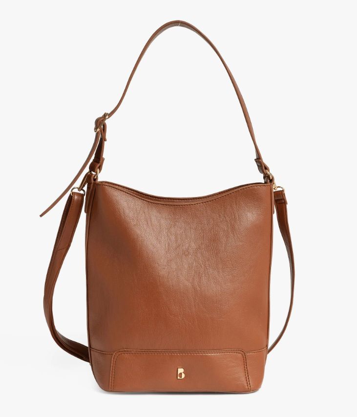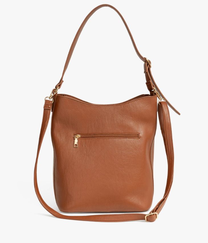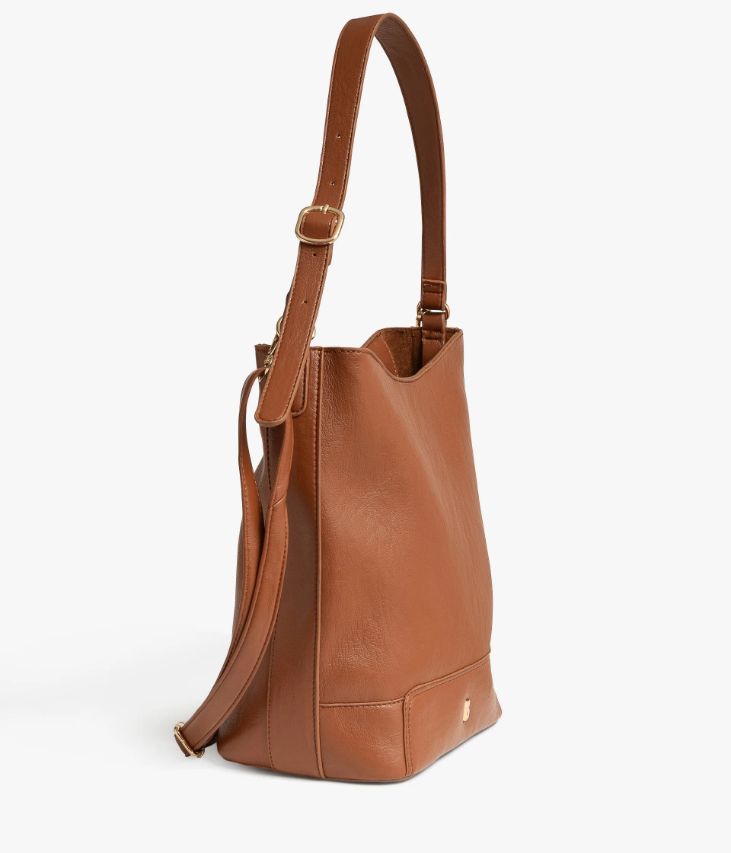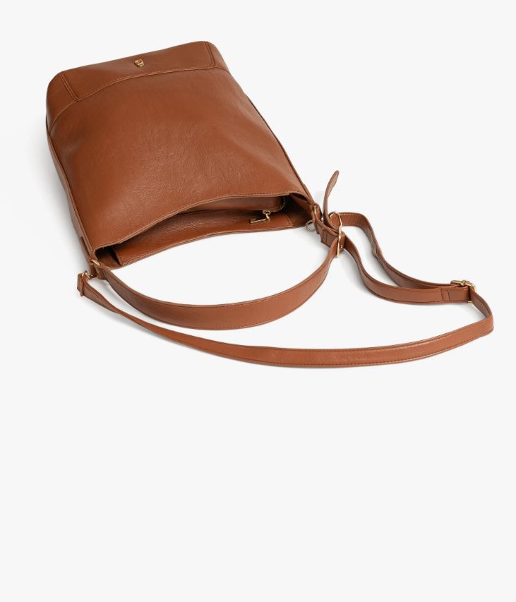 Un sac seau cognac confectionné dans une matière aspect cuir ultra souple, ornée d’un logo doré. Ce sac, fermé par un zip sur le dessus, offre un grand compartiment, une petite poche intérieure et une poche zippée sur l'arrière. Il se porte sur l’épaule grâce à une bandoulière réglable par une boucle dorée et peut se porter croisé grâce à une bride amovible dotée de mousquetons.