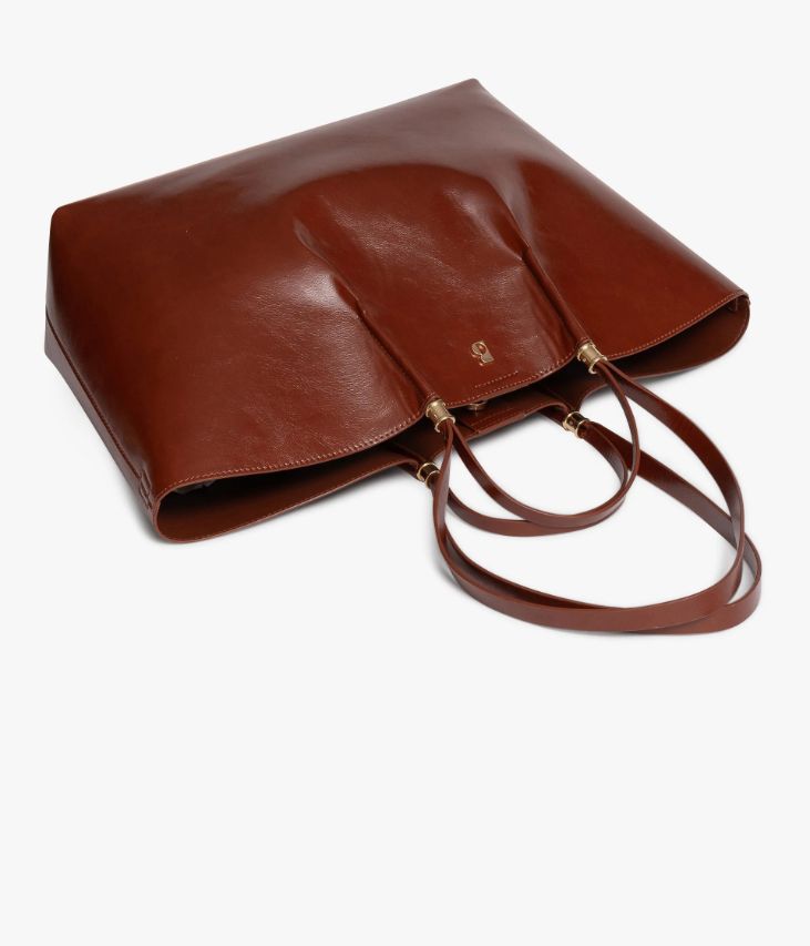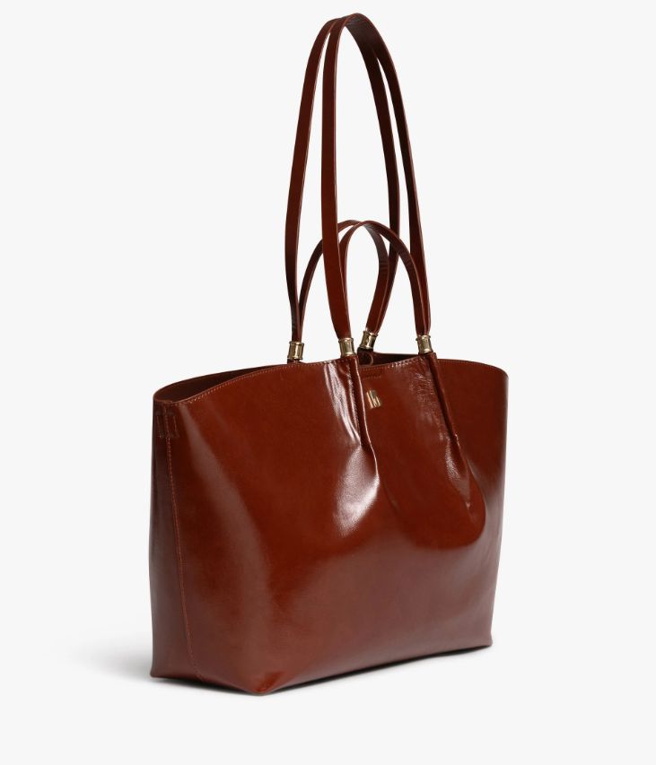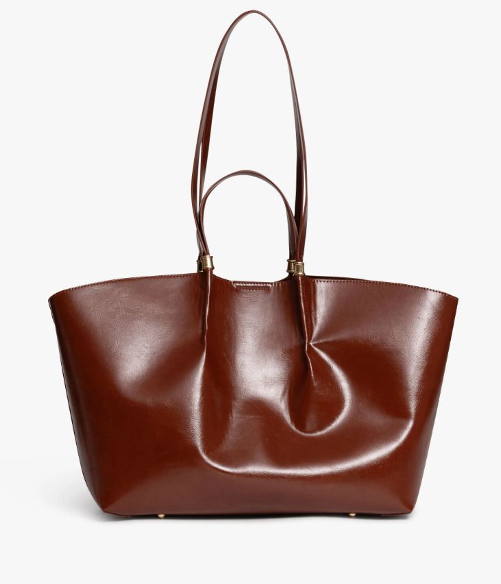 Un sac cabas cognac particulièrement élégant avec ses pinces, ses doubles anses et ses détails en métal doré. Un sac spacieux offrant un large compartiment et une pochette amovible fixée par boutons pression et fermée par un zip. Cette pochette, entièrement doublée, possède deux petites poches intérieures. Grâce à ses deux anses, ce sac peut se porter à la main ou sur l’épaule. Fermeture par bouton aimanté. Picots de protection en métal doré sous le sac. Pochette en polyester recyclé. Dimensions sac : H28 x L45 x P12 cm. Dimensions pochette : H20 x L45 x P10 cm.