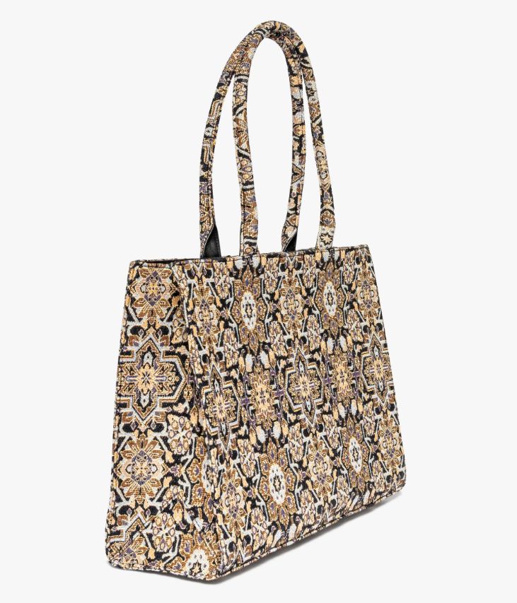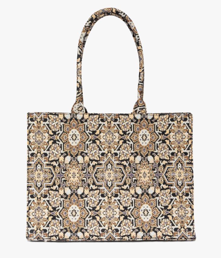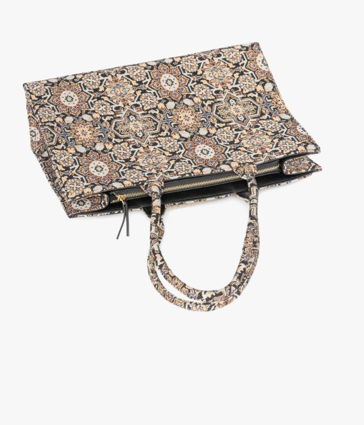Ce sac cabas en toile multicolore, façon tapisserie, ajoutera une touche vintage à toutes les tenues. Sur la toile, de fines paillettes ajoutent une touche d’éclat. Ce sac grand format offre un compartiment zippé sur le dessus pouvant contenir un ordinateur portable, des dossiers scolaires ou professionnels. Il possède également une poche plaquée et une pochette zippée. Ce cabas se porte à la main grâce à ses deux anses rigides. Sac doublé en polyester recyclé. Fond protégé par clous métalliques. Dimensions : 29*40*12 cm. Anses 23 cm.