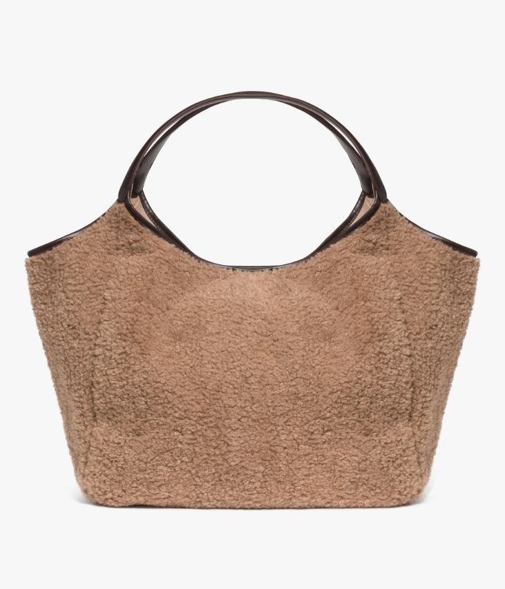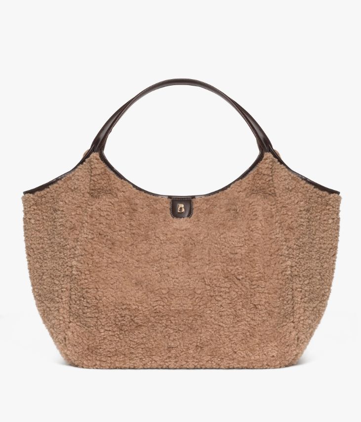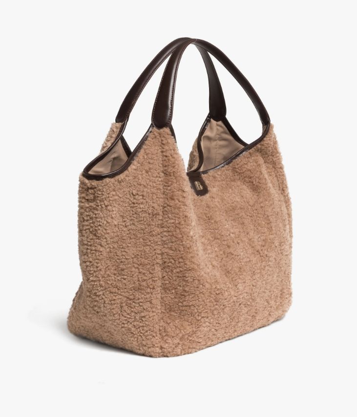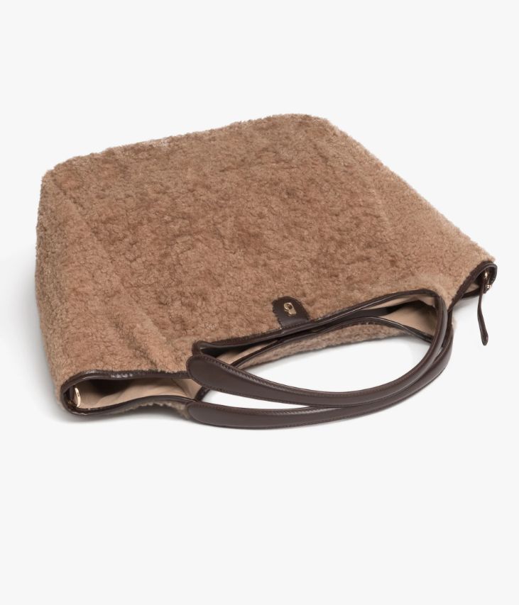 Sublime sac cabas en sherpa cappuccino et matière lisse chocolat orné d’un logo doré sur l’avant. Ce sac souple terriblement tendance, doté d’un compartiment central et de deux petites poches, offre un grand volume de rangement. A l’intérieur, une bride et des anneaux métalliques permettent de rapprocher les côtés pour modifier la forme du sac et changer de style. Il se porte sur l’épaule ou sur le bras grâce à ses anses. Fermeture par bouton aimanté. Fond plat. Doublure en polyester recyclé. Dimensions : H35 x L35 x P18 cm.