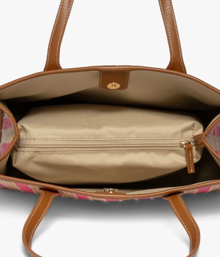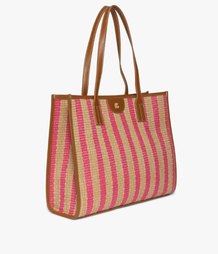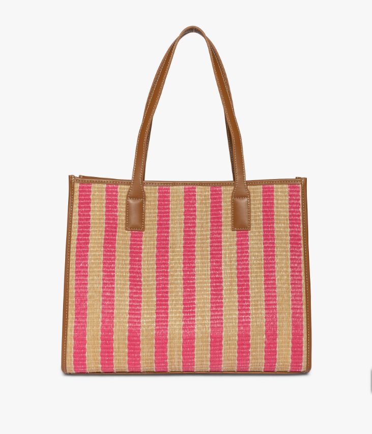 Un grand sac cabas beige et rose confectionné en raphia synthétique et incrusté de fil de lin. Il possède des anses et des empiècements en matière cognac imitation cuir qui rehaussent son style. Ce sac cabas offre un beau volume de rangement grâce à un grand compartiment et une pochette zippée contenant deux poches plaquées et une poche zippée. Doublure textile. Fermeture par bouton aimanté. Petit logo métallique sur l’avant. Dimensions : H31 x L38 x P10 cm. Anses 24 cm.