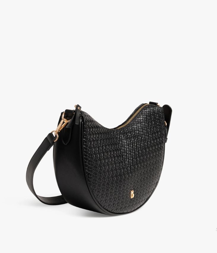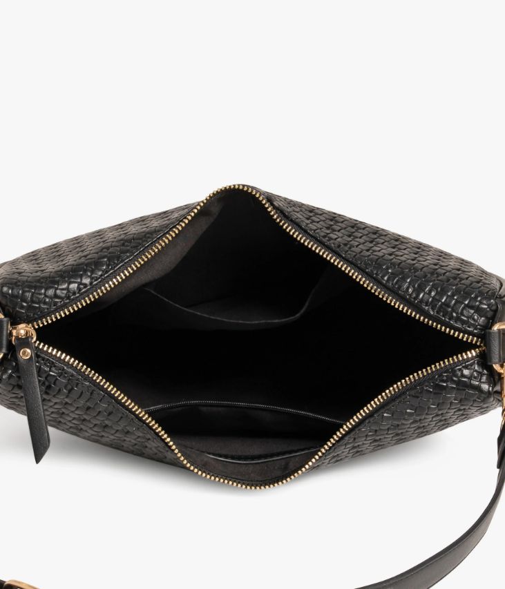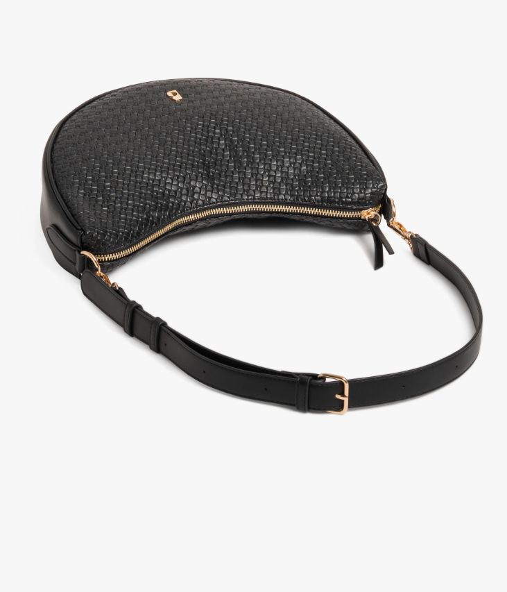Ce joli sac noir séduit par ses jolies courbes et sa matière embossée effet tressé. Un sac à main femme format demi-lune agrémenté d'un logo en métal doré sur l'avant. Il offre un compartiment et deux petites poches, et se ferme à l'aide d'un zip sur le dessus. Il possède une bandoulière réglable et amovible qui se porte double pour un porté épaule ou simple pour un porté croisé.Dimensions : H18 x L30 x P9 cm.