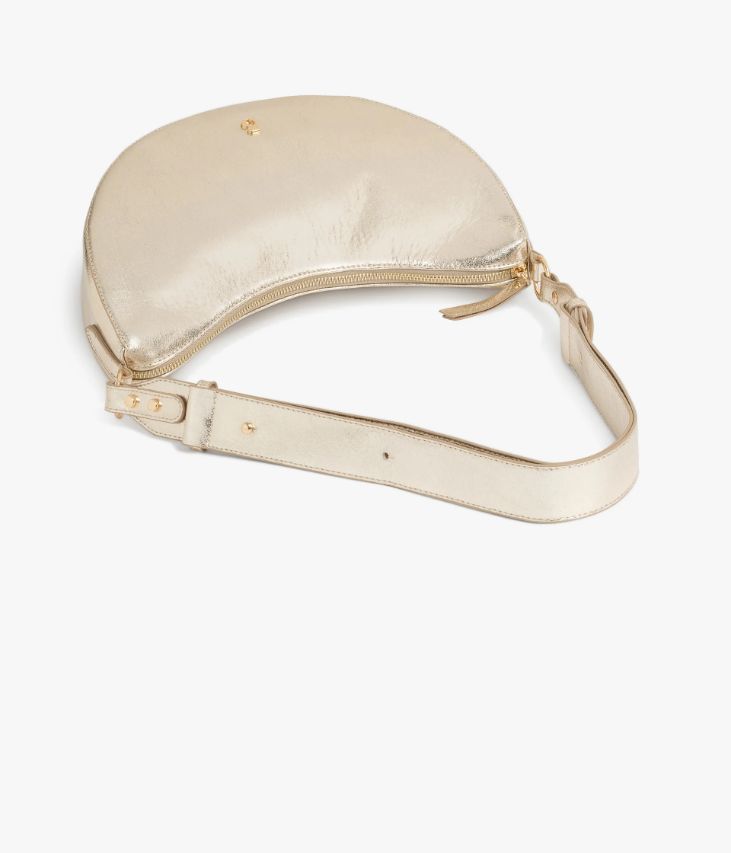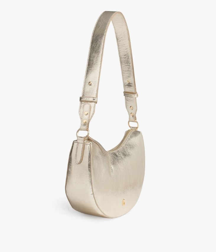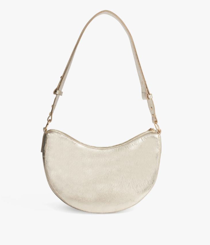 Ce joli sac platine séduit par ses jolies courbes. Un sac à main femme format demi-lune agrémenté d'un logo en métal doré sur l'avant. Il offre un compartiment et deux petites poches, et se ferme à l'aide d'un zip sur le dessus. Il possède une bandoulière réglable par picots métalliques qui se porte double pour un porté épaule ou simple pour un porté croisé. Doublure en polyester recyclé. Dimensions : H17 x L30 x P9 cm.