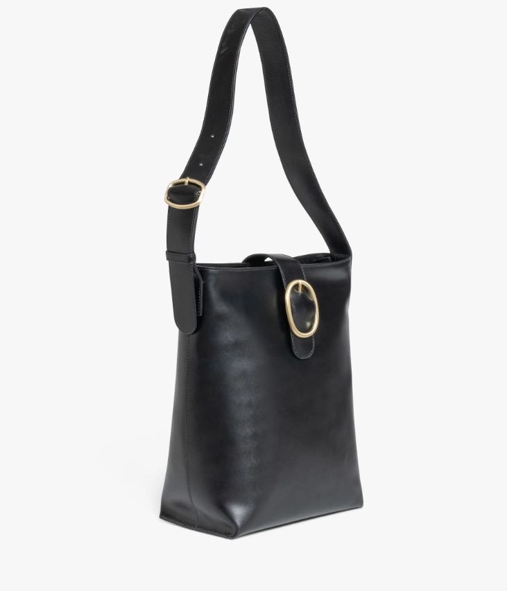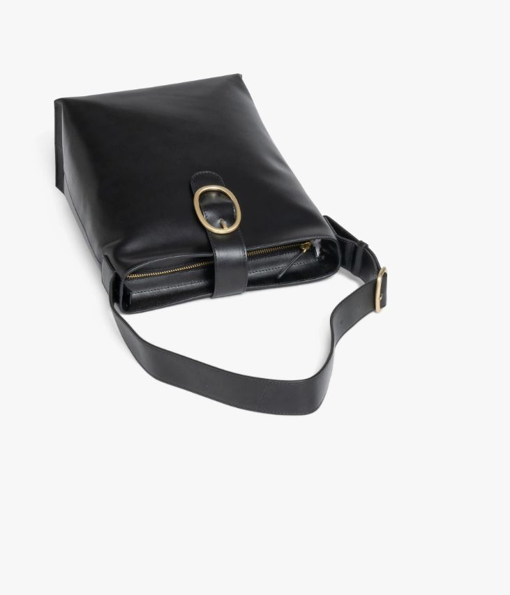 Un sac en cuir noir au look sobre et élégant, orné de boucles en métal brossé, l'une sur la bride de fermeture, l'autre sur la bandoulière. Un sublime sac à porter sur l'épaule et à marier facilement à l'ensemble du dressing. Il offre un compartiment unique et trois petites pochettes format carte bancaire. Doublure textile avec monogramme. Fermeture zippée et bouton aimanté sous la bride. Dimensions : H31 x L23 x P11 cm.