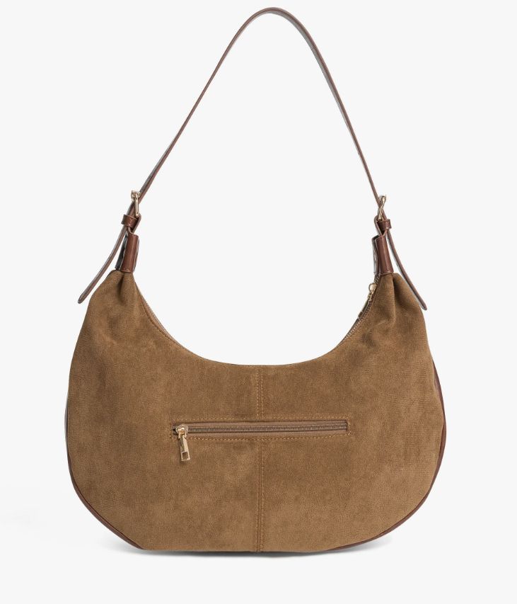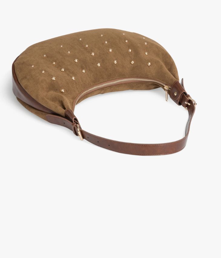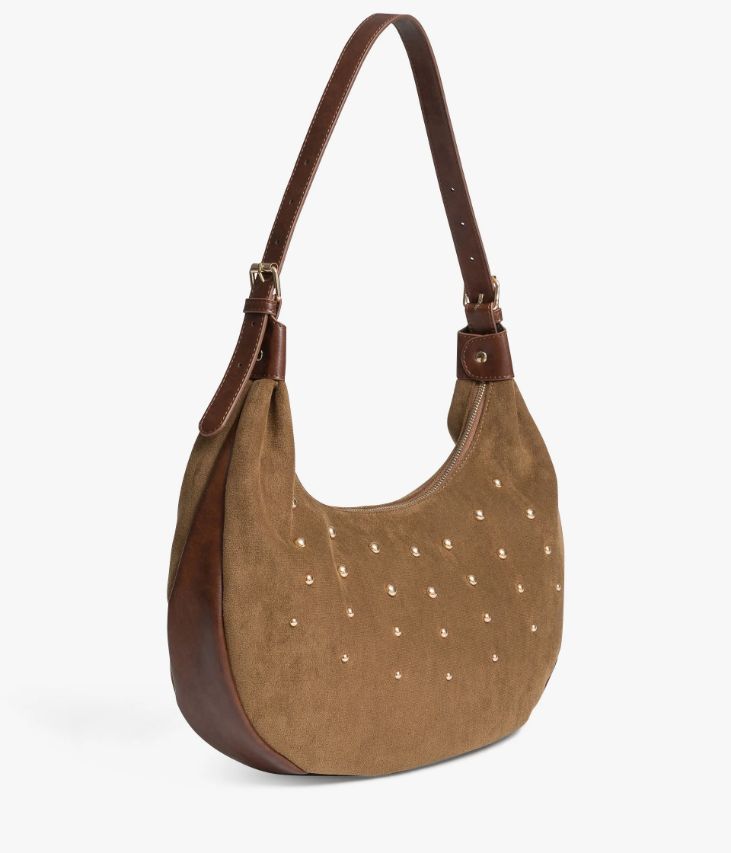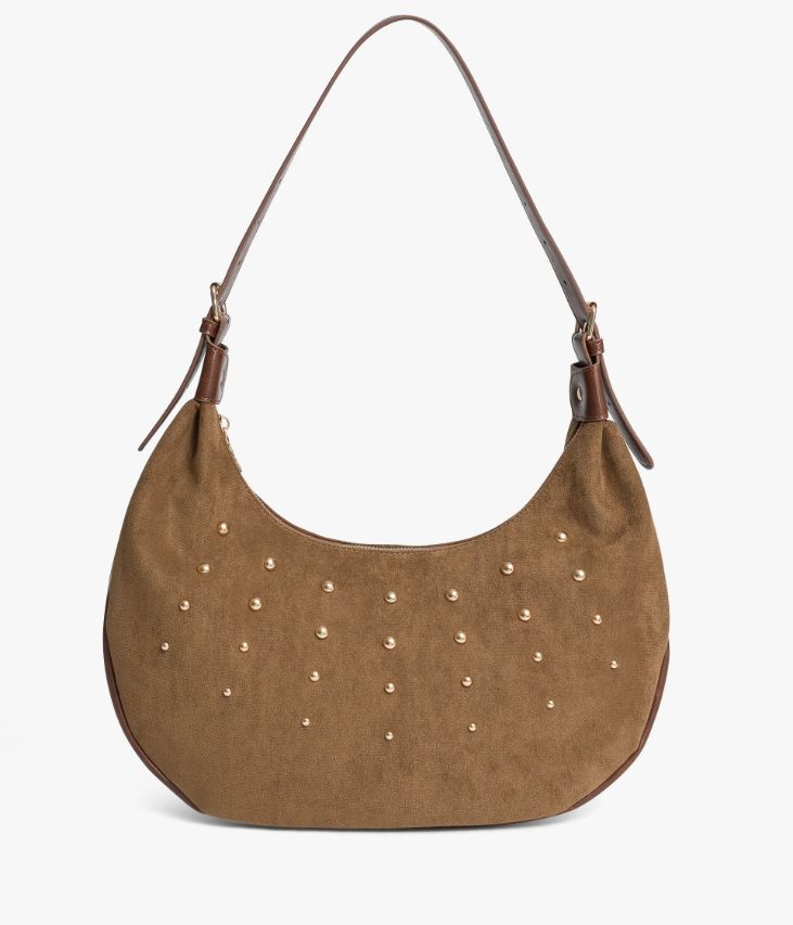 Un sublime sac couleur havane confectionné en suédine, orné de clous en métal doré. Il possède une bande en matière synthétique cognac et une anse assortie. Ce sac demi-lune, fermé par un zip sur le dessus, offre un grand compartiment, trois pochettes intérieures et une poche zippée au dos. Il se porte sur l’épaule et s’ajuste à l’aide de deux boucles à ardillon sur l’anse. Doublure en polyester recyclé.