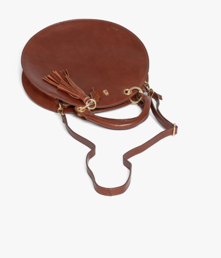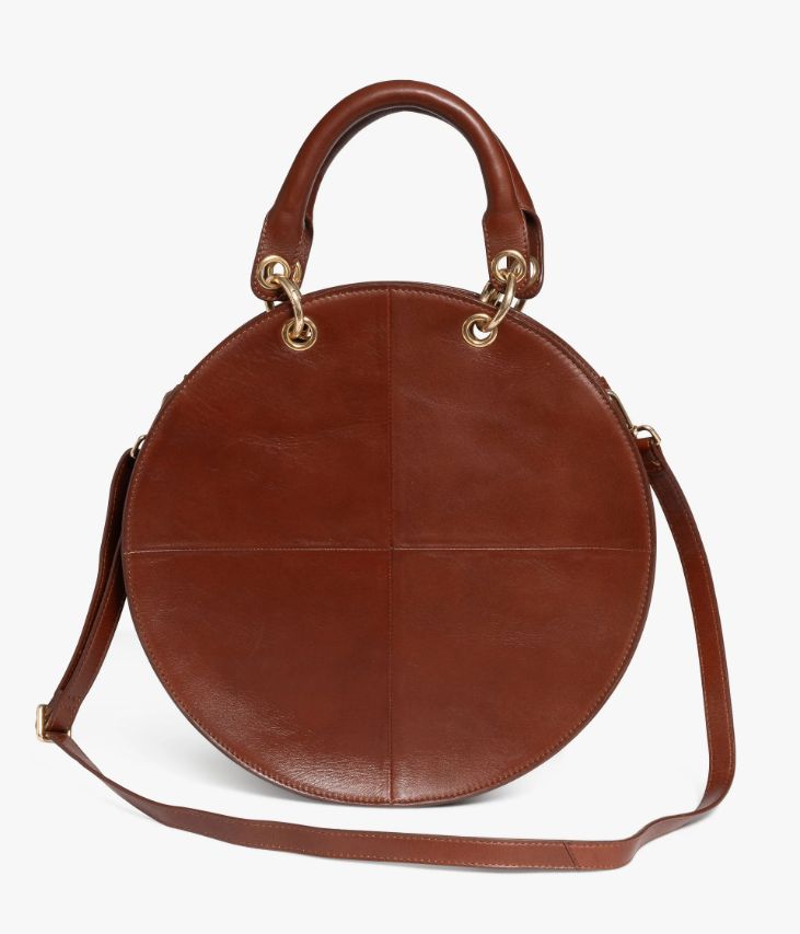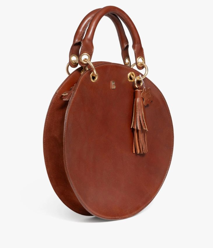 Devenu iconique, ce sac à main séduit par l'originalité de sa forme ronde. Un sac cognac en cuir lisse et cuir velours sur les côtés, orné de surpiqûres d’un côté et d’un joli logo doré de l’autre. Grâce à ses anneaux dotés d’un système d’ouverture, ce sac peut se porter à la main ou sur l’épaule à l’aide des anses ou de la bandoulière. Il est décoré d’une pampille amovible. Le compartiment renferme deux poches plaquées et une pochette zippée, il se ferme par zip sur le dessus. Doublure coton. Sac livré dans un pochon en coton. Dimensions : 34*34*6 cm.