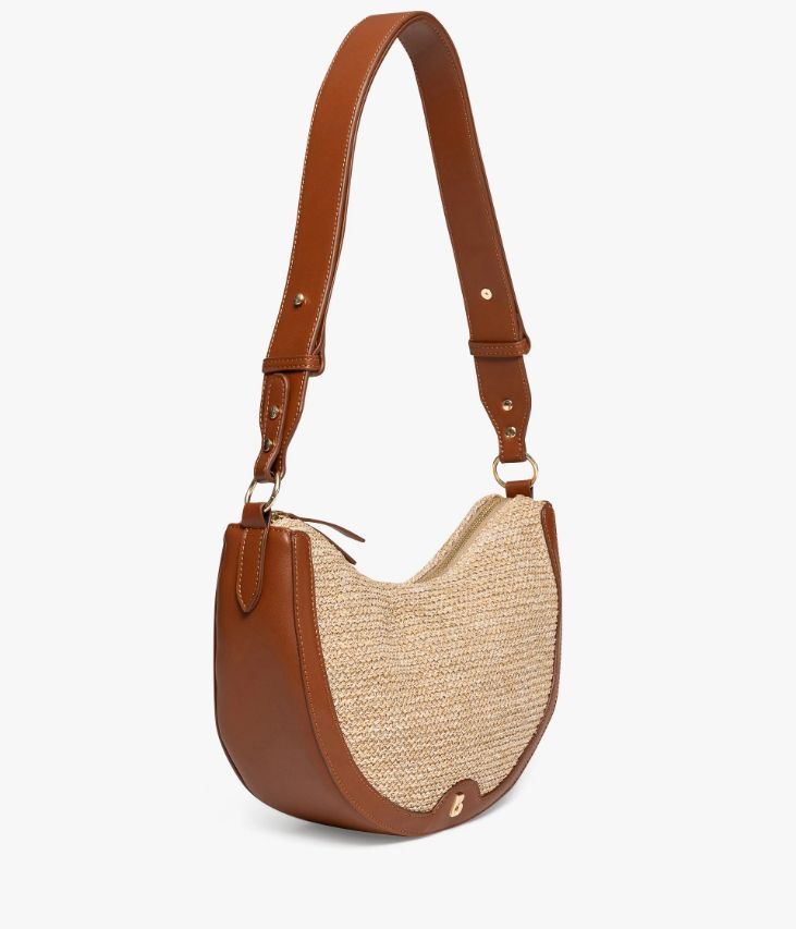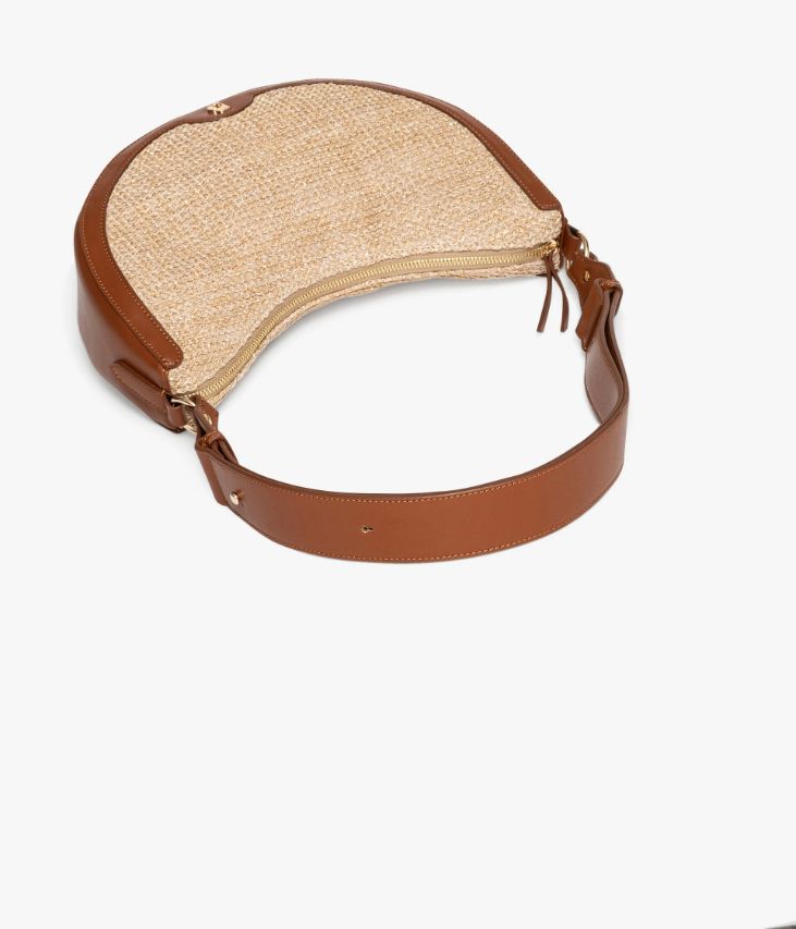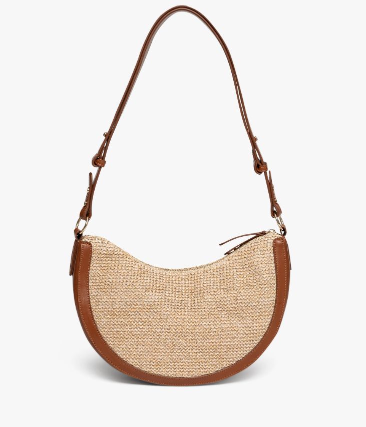 Ce sublime sac demi-lune s’affiche dans une alliance de raphia synthétique incrusté de fil métallisé et de matière effet cuir cognac. Il est orné d’un logo doré sur l’avant et possède une bandoulière réglable permettant un double porté sur l’épaule ou croisé. Fermé par un zip, il offre un compartiment, une pochette zippée et une poche plaquée. Doublure en polyester recyclé.