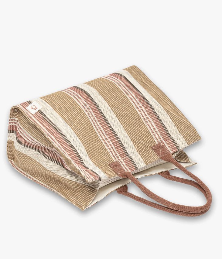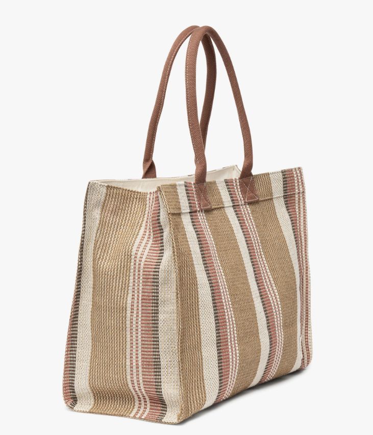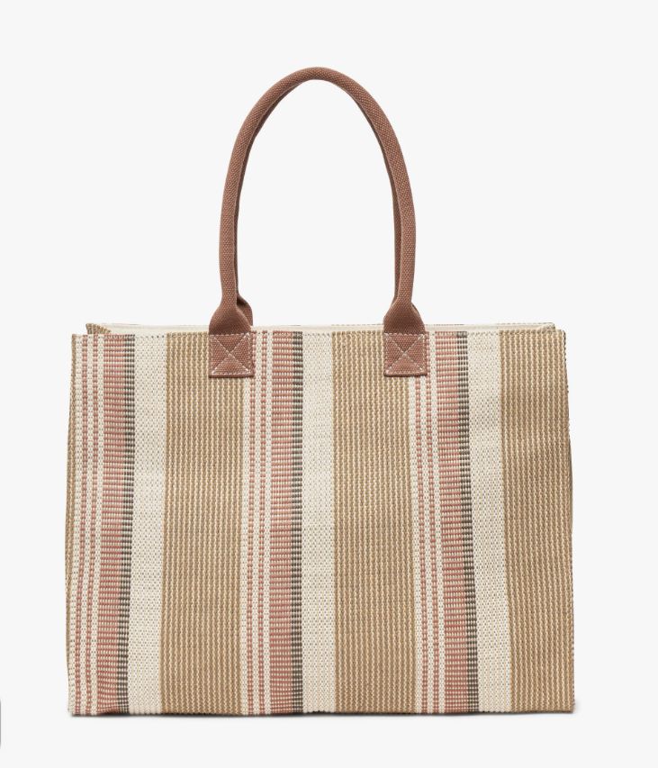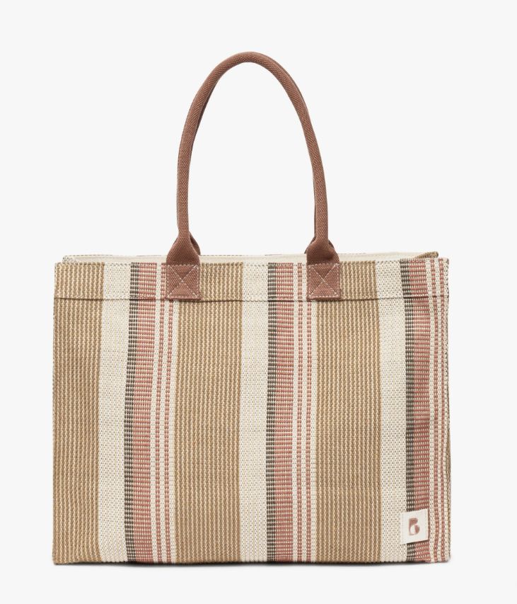 Un sac cabas en toile tissée décliné dans un élégant mélange de camel, d’écru et de rouille. Un sac au volume idéal pour vous accompagner au quotidien. Fermé par un zip sur le dessus, il offre un grand compartiment, une pochette zippée et deux pochettes plaquées. Ce grand sac, entièrement doublé et résistant, peut facilement accueillir des documents A4 et un ordinateur portable. Il se porte à la main ou sur l’épaule grâce à deux anses. Un sac à porter en ville, au travail ou comme en sac de cours. Doublure en polyester recyclé. Picots de protection en métal sous le fond. Dimensions : H35 x L46 x P18 cm. Anses : 23 cm.