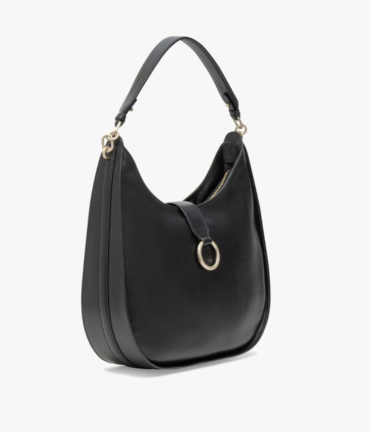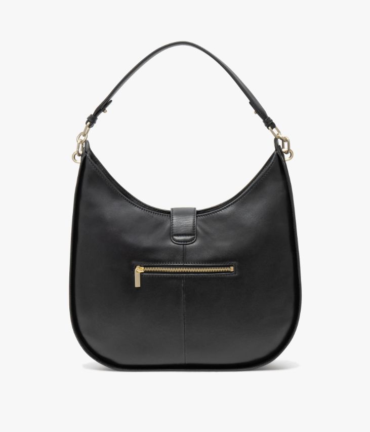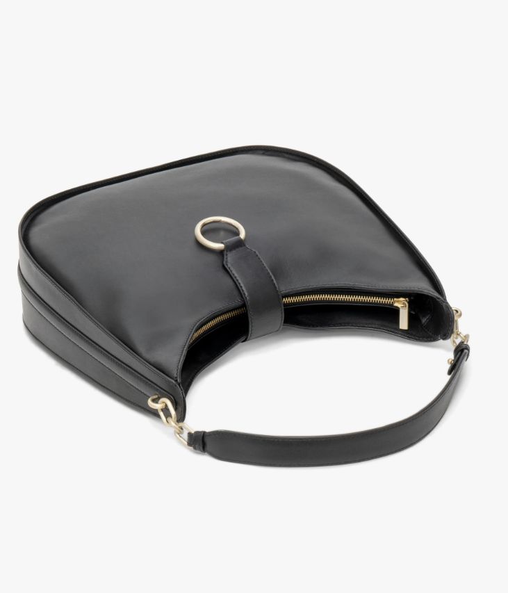 Un élégant sac en cuir noir au format idéal pour le quotidien. Ce sac à bandoulière possède un grand compartiment, trois pochettes intérieures et une poche zippée au dos. Il se ferme par zip sur le dessus et par une bride agrémentée d’un anneau métallique dissimulant un aimant. La bandoulière intègre des mailles métalliques, ajoutant une touche de raffinement. Doublure avec monogramme Bocage. Dimensions H25 x L36 x P10 cm. Sac livré dans un pochon en coton.