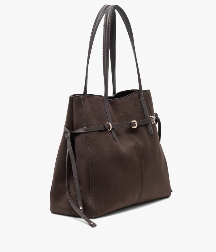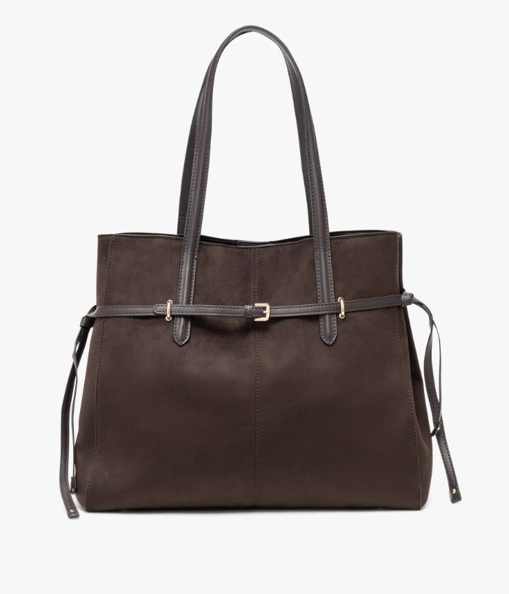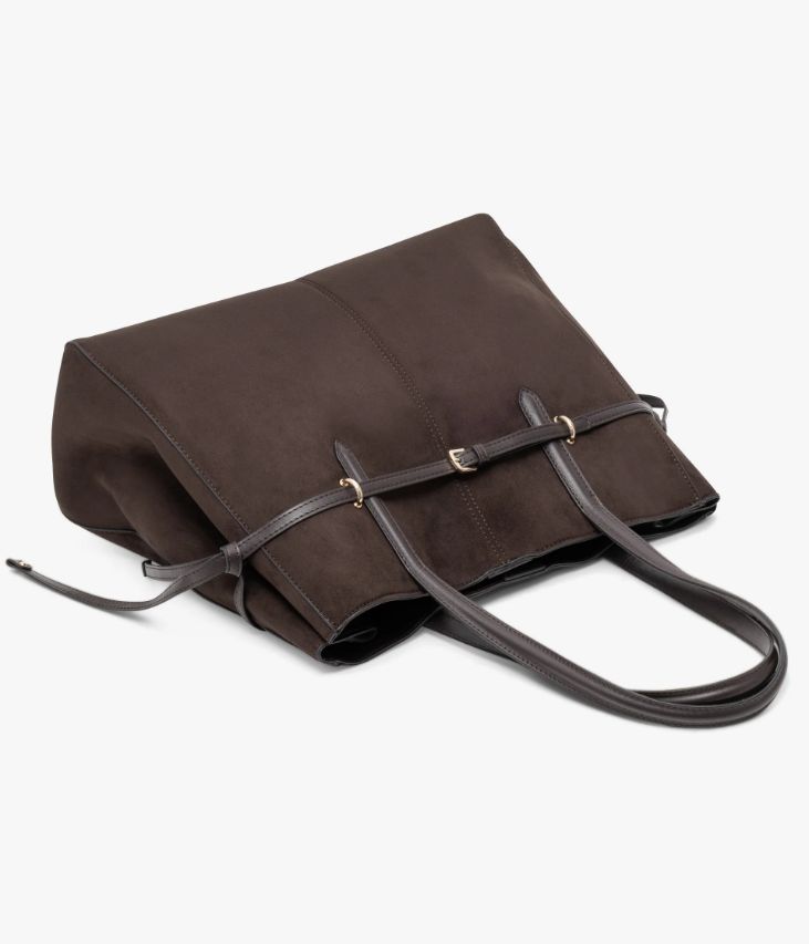Un très joli sac cabas chocolat parfait pour celles qui souhaitent allier élégance et praticité. Sa matière suédine est agrémentée de brides lisses en cuir synthétique, nouées sur les côtés. Conçu pour les femmes actives, ce sac est l'accessoire indispensable pour transporter toutes vos affaires personnelles et professionnelles. Il possède un format idéal pour accueillir un ordinateur portable ou une tablette. Ce sac offre trois compartiments, dont un fermé par un zip, et trois pochettes intérieures. Il se ferme à l’aide d’un bouton aimanté et possède deux anses pour un porté épaule. Picots de protection en métal sous le sac. Dimensions : H33 x L40 x P14 cm.