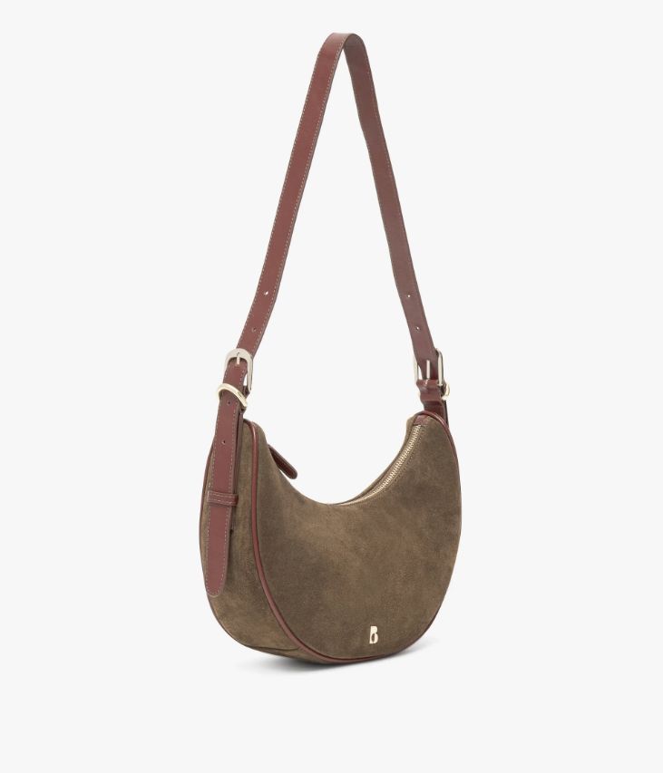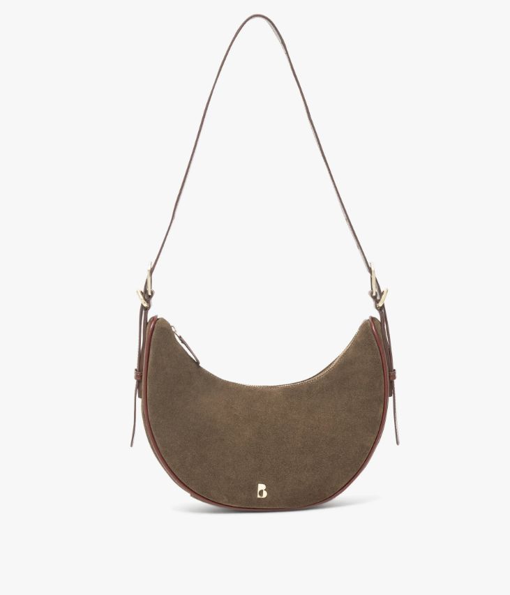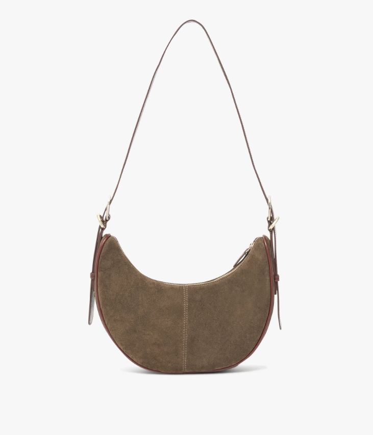 Ce sac en cuir velours couleur havane s’intégrera à merveille dans le dressing féminin. Il arbore une forme demi-lune soulignée par de jolie finitions en cuir lisse cognac et un logo doré sur l’avant. Ce sac, fermé par un zip sur le dessus, offre un compartiment et deux pochettes intérieures. Il se porte sur l’épaule ou croisé grâce à une bandoulière ajustable par deux boucles à ardillon. Doublure en coton. Sac livré dans une pochette en coton.