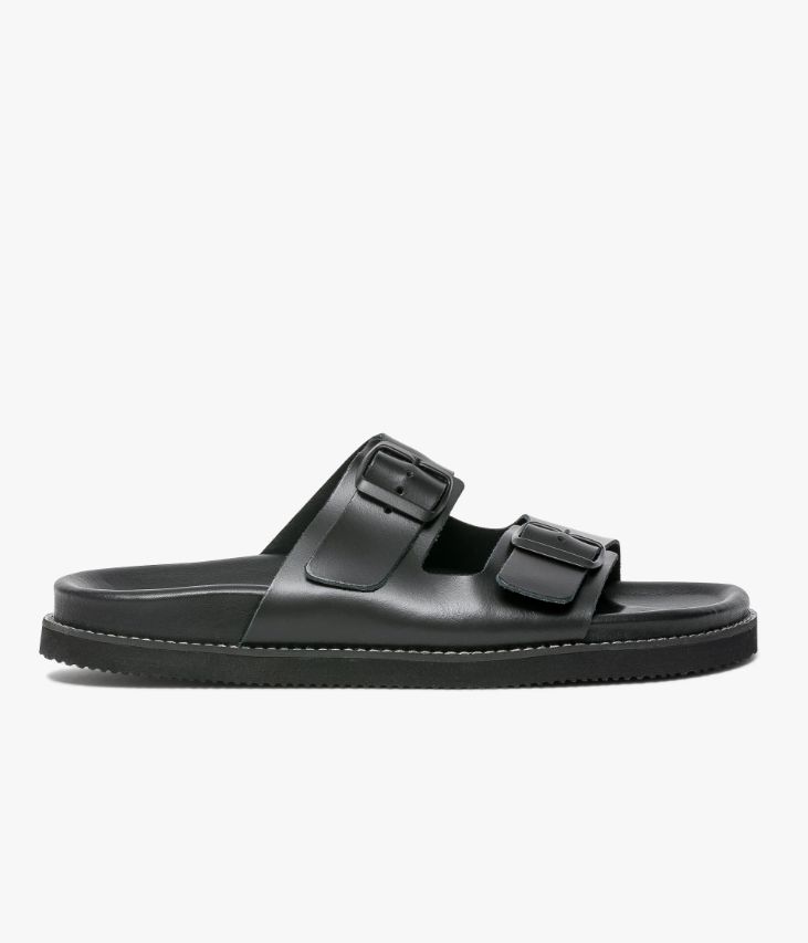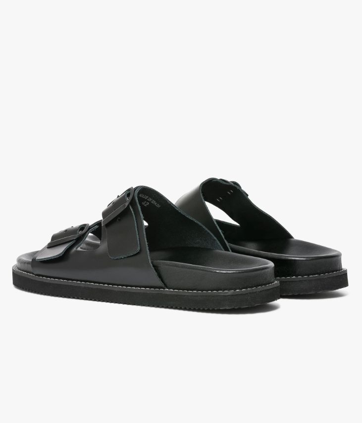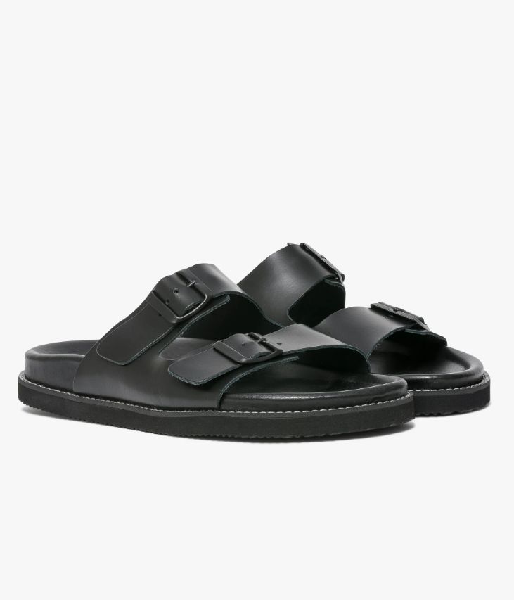 Une sandale noire en cuir lisse fabriquéeavec soin dans notre atelier en Espagne. Unechaussure ouverte dotée de deux larges brides ajustables par boucle ton sur ton. Elleoffre un grand confort grâce à sa semelle intérieure anatomique en cuir dotée d’unefine mousse. Elle estposée sur une semelle antidérapante avec trépointe surpiquée.