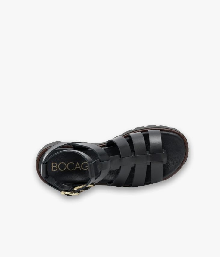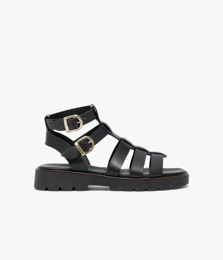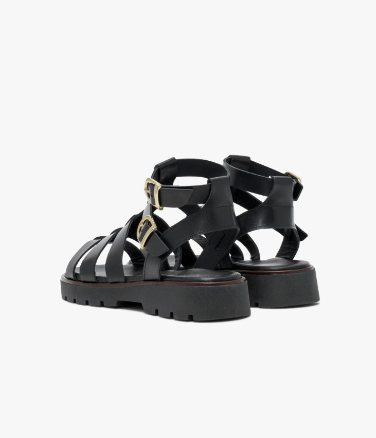 Une sandale en cuir noir fabriquée avec soin au Portugal. Inspirée des Spartiates, cette sandale enveloppe le pied et la cheville de larges brides, offrant un excellent maintien. Elle s’ajuste et se ferme à l’aide de deux boucles en métal doré. Elle repose sur une semelle crantée en gomme ultra légère avec trépointe cuir. Une chaussure doublée cuir, dotée d’une semelle intérieure cuir moussée très confortable. Incontestablement le hit mode de la saison ! Semelle 2 cm.