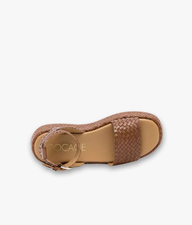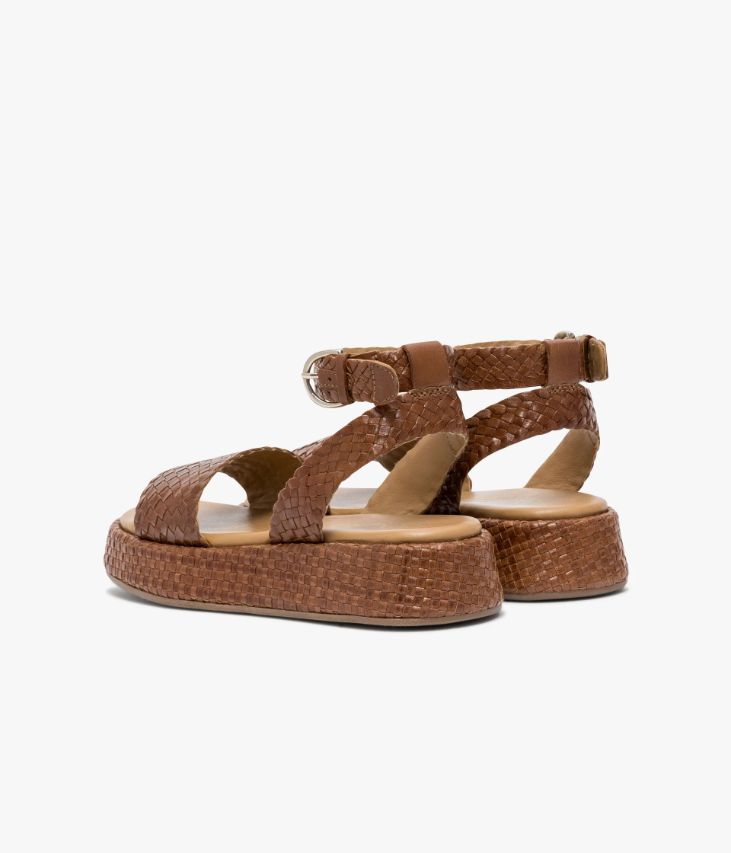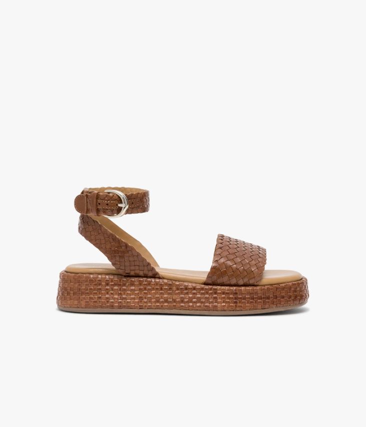 Une sandale en cuir cognac fabriquée avec le plus grand soin. Cette sandale plate ajoutera une touche authentique aux tenues estivales avec ses brides et son imposante semelle enrobée, issues d’un tressage artisanal. Elle s’ajuste à la cheville grâce à une jolie boucle dorée. Une chaussure doublée cuir avec semelle intérieure cuir dotée d’une fine mousse. Semelle 3 cm.