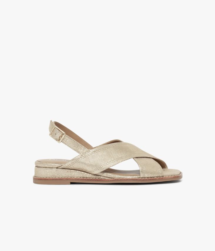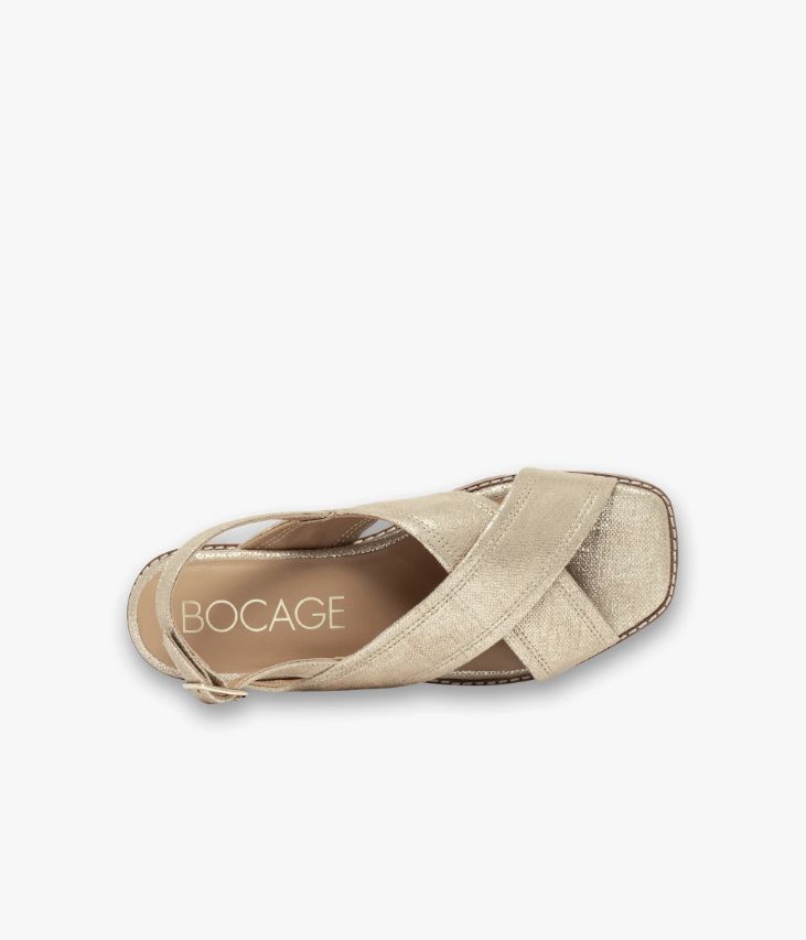 Une sandale dorée en cuir velours métallisé fabriquée avec le plus grand soin. Composée de larges brides croisées sur le dessus et d’une fine bride à l’arrière du talon, elle enveloppe parfaitement le pied. Inspirée du vestiaire rétro, elle repose sur une semelle à bout carré avec trépointe cuir piquée et petit talon compensé. Notre technologie Bocage Innovation vous garantit un bien-être inégalé. La semelle dissimule des élastiques qui permettent à votre chaussure de s’adapter à votre pied. Une chaussure entièrement doublée cuir avec semelle intérieure cuir dotée d’une fine mousse. Elle se ferme à l’aide d’une fine boucle dorée.