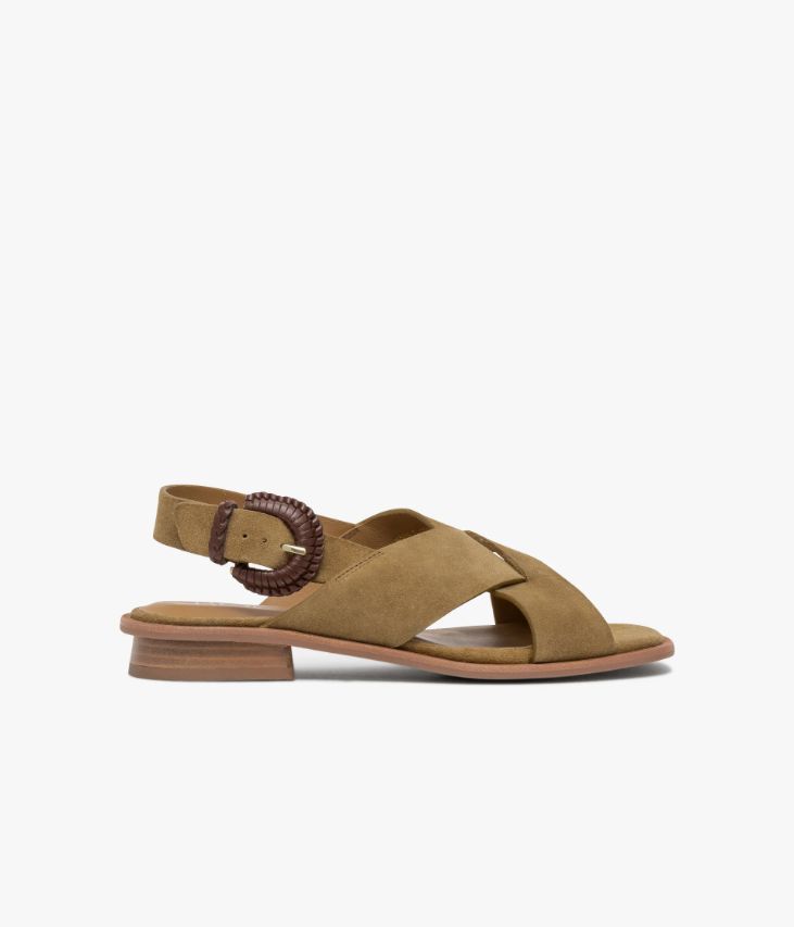 Une sandale en cuir velours camel fabriquée avec le plus grand soin. Idéale pour le quotidien, elle enveloppe le pied de larges brides entrecroisées, assurant un excellent maintien. La bride arrière se ferme à l’aide d’une jolie boucle recouverte de lanières de cuir lisse couleur chocolat. Cette sandale repose sur une semelle fine à bout carré et un petit talon lamellé collé positionné en retrait. Notre technologie Bocage Innovation vous garantit un bien-être inégalé. La semelle dissimule des élastiques qui permettent à votre chaussure de s’adapter à votre pied. Une chaussure entièrement doublée cuir avec semelle intérieure cuir moussée.