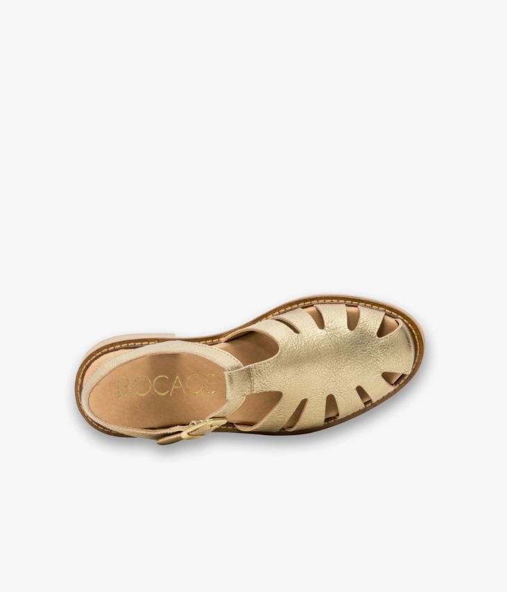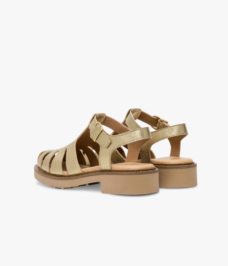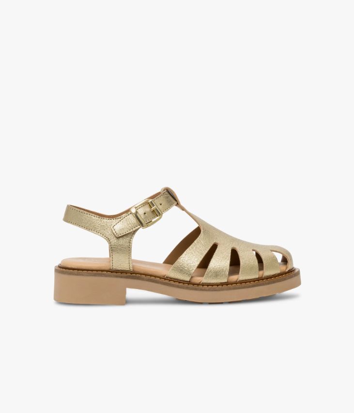 Une sandale en cuir or fabriquée avec soin au Portugal. Une sandale fisherman à la structure enveloppante offrant un excellent confort de marche. Elle se ferme à l’aide d’une boucle dorée sur la bride cheville. Une chaussure entièrement doublée cuir avec semelle intérieure cuir moussée. Elle repose sur une semelle antidérapante avec trépointe cuir piquée et un petit talon confortable. Semelle 1,5 cm.