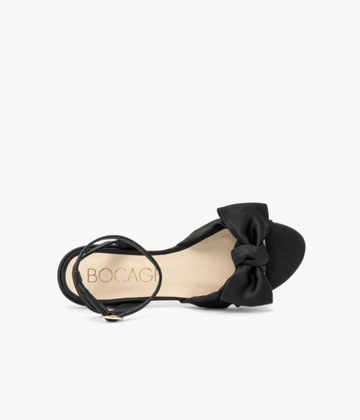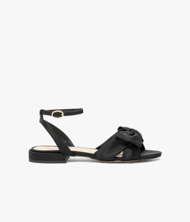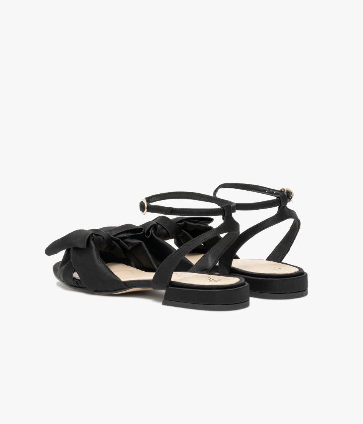 Une sandale en satin noir fabriquée avec soin au Portugal. Une sandale plate dotée de brides souples entrecroisées, surmontées d’un large nœud et d’une fine bride mobile autour de la cheville fermée par une boucle dorée. Une chaussure de cérémonie idéale pour ajouter une touche d’éclat aux looks de fête. Une chaussure doublée cuir avec semelle intérieure cuir dotée d’une fine mousse. Elle repose sur une semelle fine avec petit talon flare enrobé. Talon 1,5 cm.