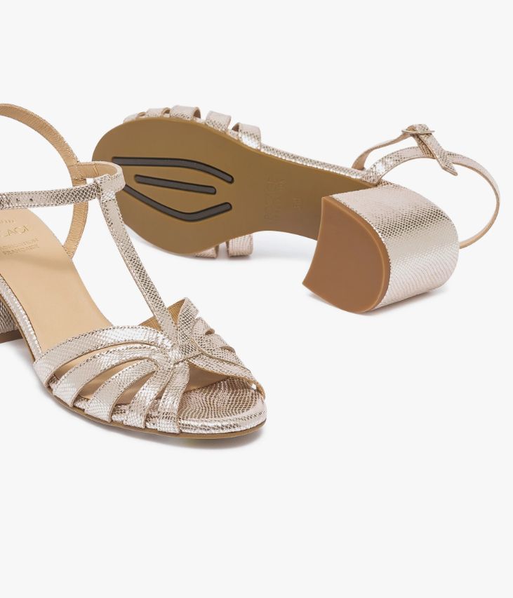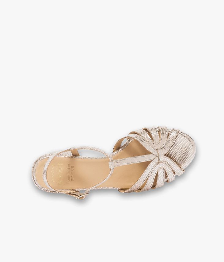 Une sandale platine en cuir velours métallisé à motifs écailles, fabriquée avec soin dans notre atelier en France, au coeur du Maine et Loire (49). Une chaussure forme Salomé qui convient à toutes les morphologies. Entièrement doublée cuir avec semelle intérieure cuir, elle est posée sur une semelle fine et talon enrobé. Notre technologie Bocage Innovation vous garantit un bien-être inégalé. La semelle dissimule des élastiques qui permettent à votre chaussure de s’adapter à votre pied. Fermeture par boucle dorée.